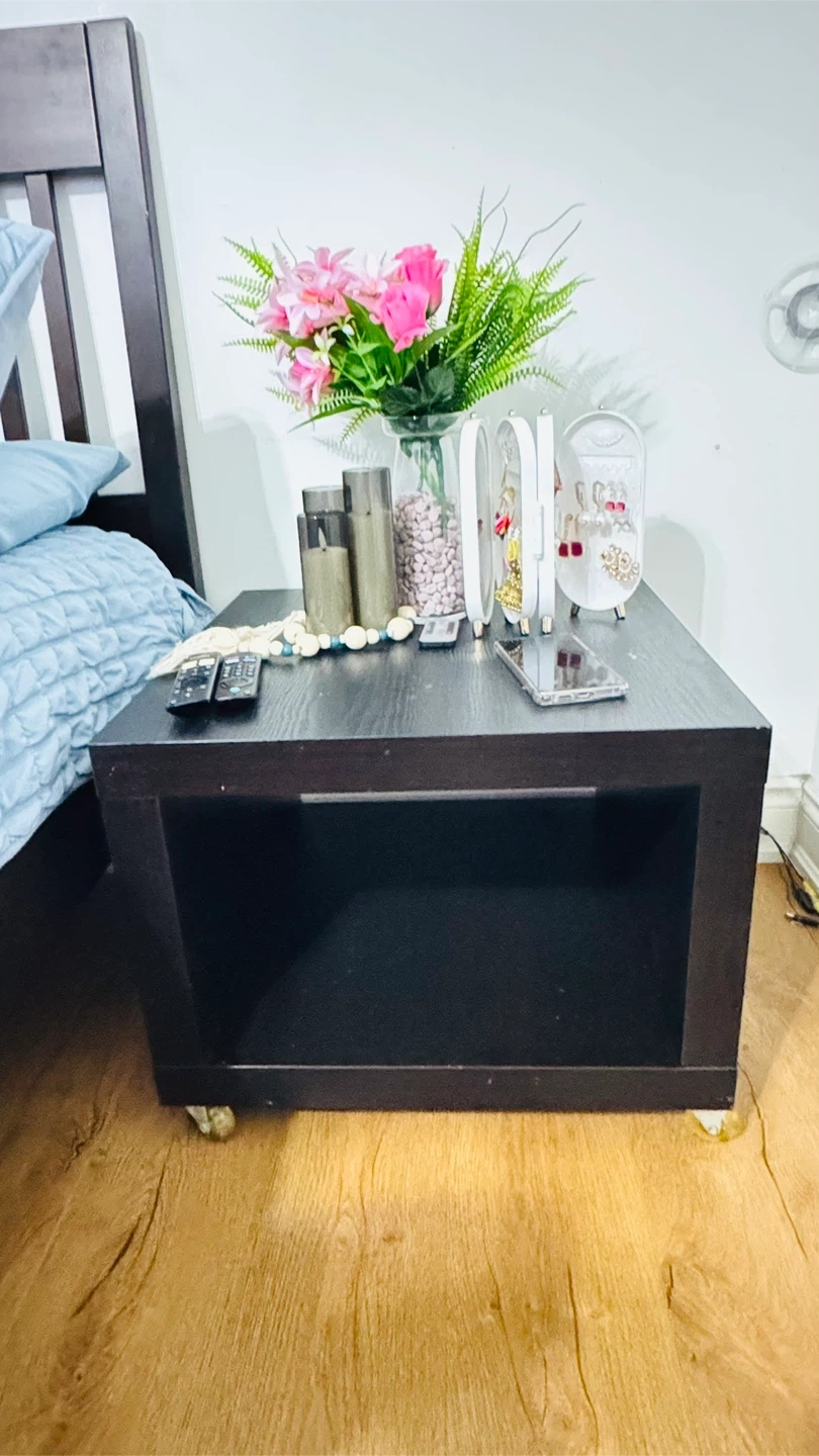 This dark brown cube side table features a handy open shelf for storage. It's on wheels, making it easy to move. A simple, functional piece for your bedroom or living space!