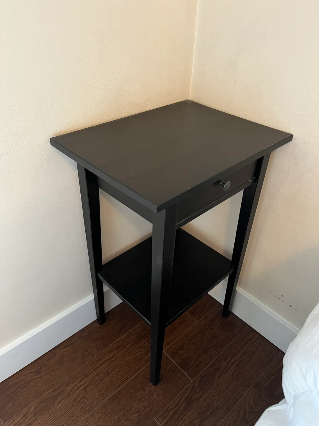This black side table has a convenient drawer and a lower shelf for storage. It's made of a dark wood material. This table is useful for placing beside a bed or sofa.