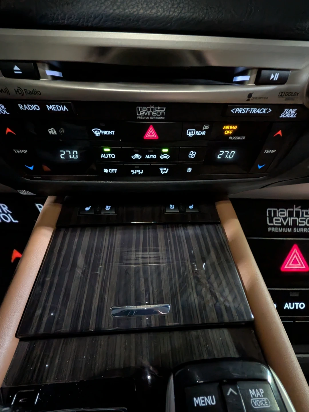 Rear Executive Controls: armrest with controls for climate, audio, and rear heated seats.