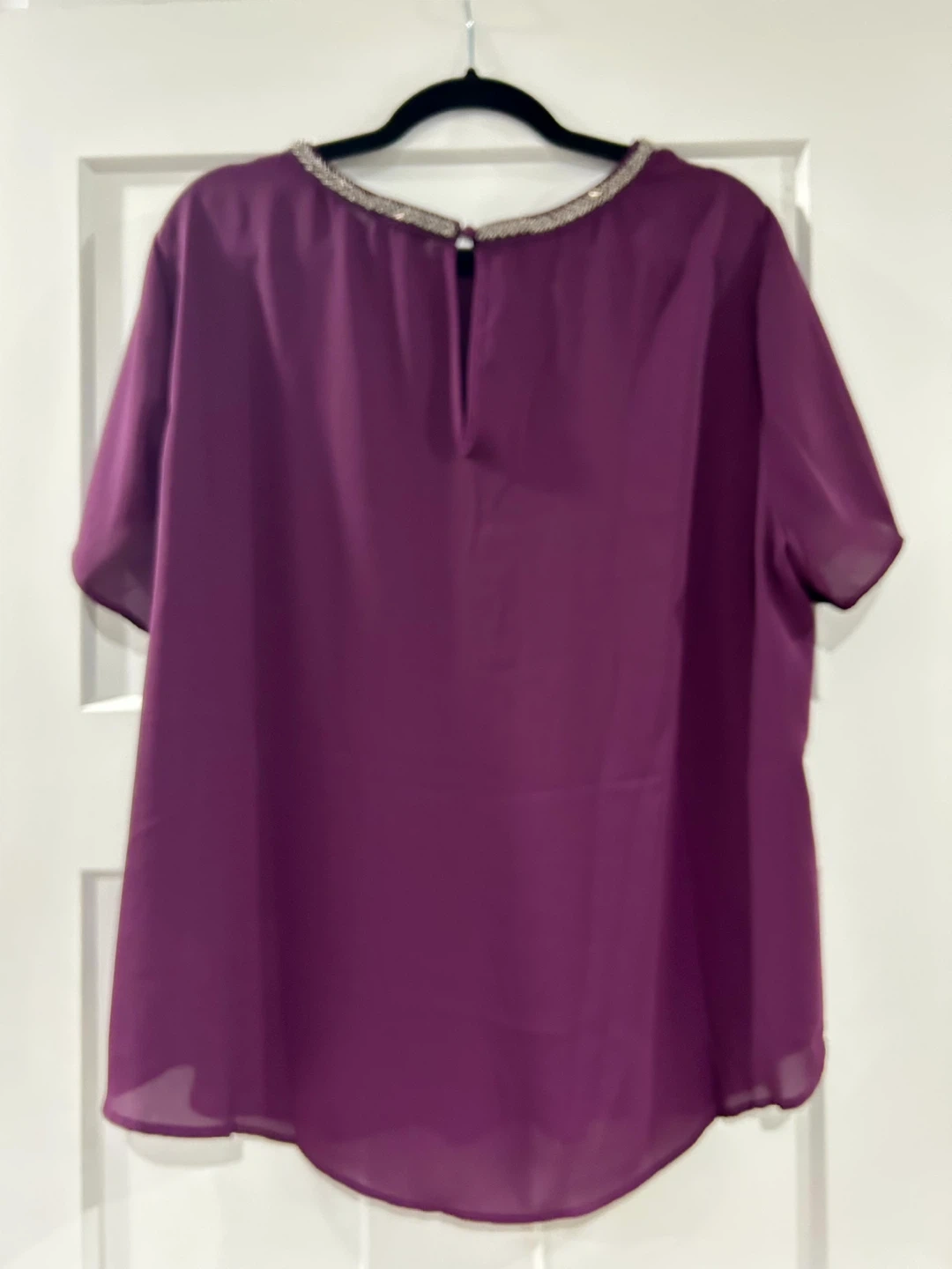 Brand new Torrid georgette blouse in a rich Winter Bloom (deep purple) shade. Lightweight, flowy, and slightly sheer with a beautiful embellished neckline. Easy to dress up for work or wear out.