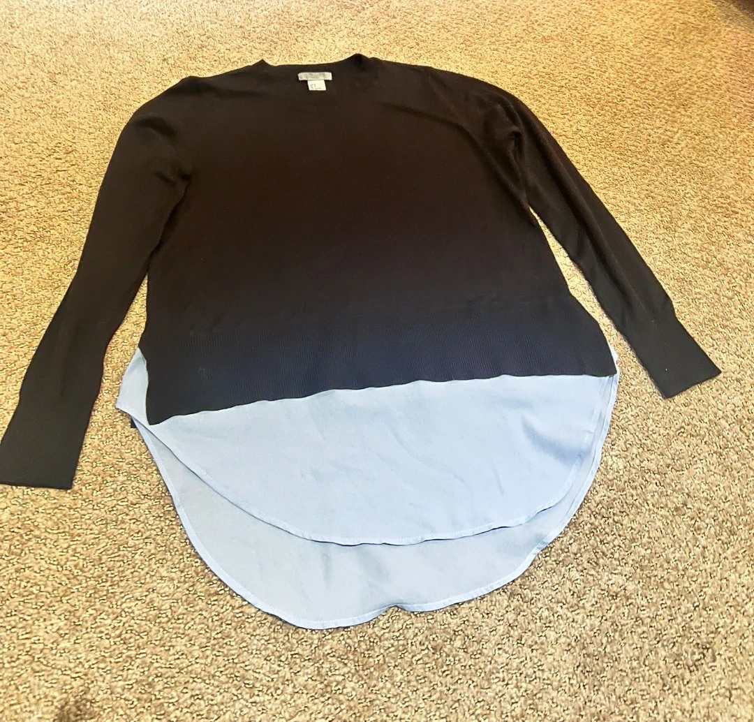 This black long-sleeved sweater has a light blue lower layer. It's a stylish piece for any wardrobe. Offers a comfortable, layered look.