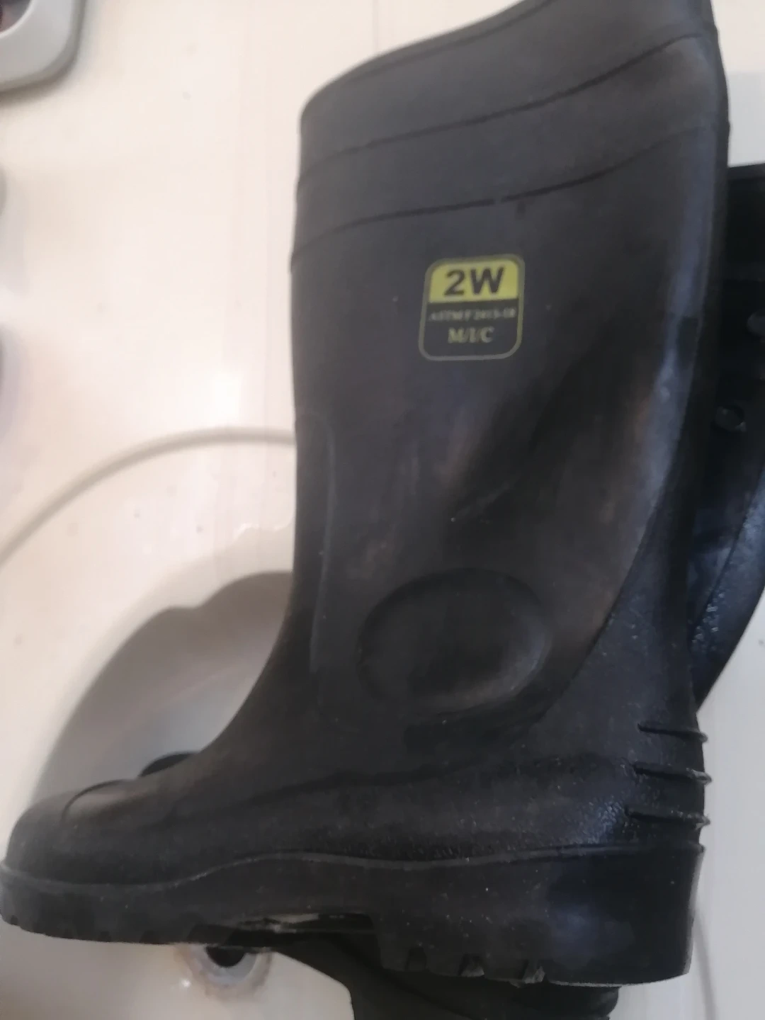 These are black steel toe rubber work boots from 2W. They feature a durable construction suitable for various work environments. The size is marked as M/C, and there are also markings for 38/45 on the sole.