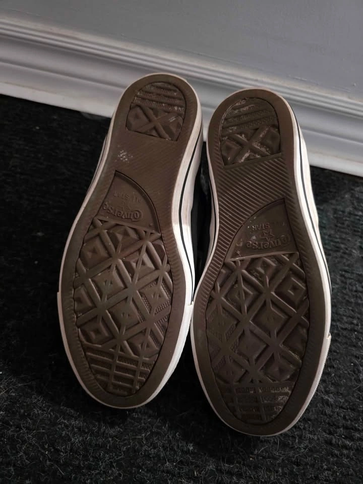 Men's size 8 Converse Chuck Taylor shoes. Colors are grey with an army print design on the inside. These sneakers feature the iconic Converse logo on the tongue and comfortable ankle padding.