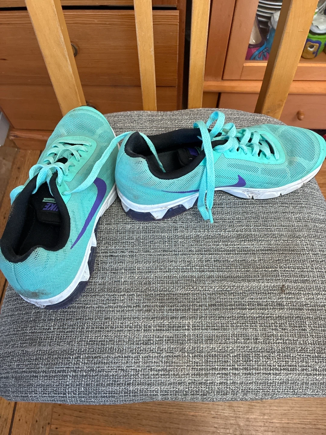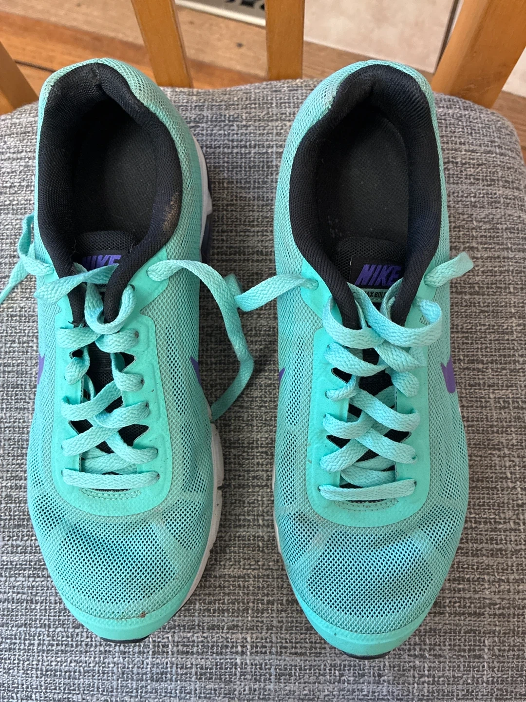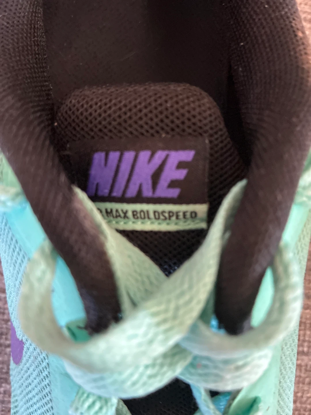 These Nike Air Max Boldspeed running shoes come in a cool teal colour with purple accents. They feature a breathable mesh upper and a supportive sole. Great for everyday runs!