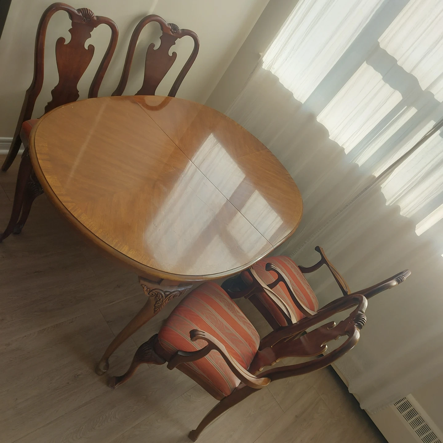 Classic oval dining table with a polished wood finish. Comes with four upholstered chairs featuring striped fabric. Great for family meals or entertaining guests!