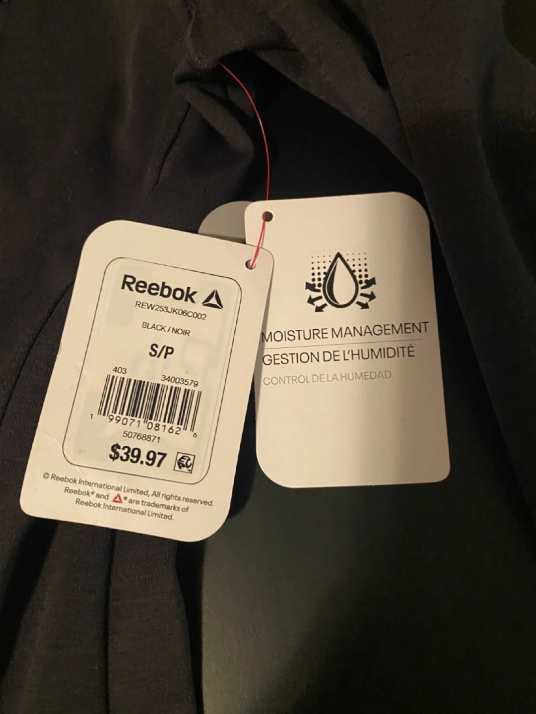 Selling a Reebok black slim fit jacket in size small. It's in great condition and features moisture management technology.
