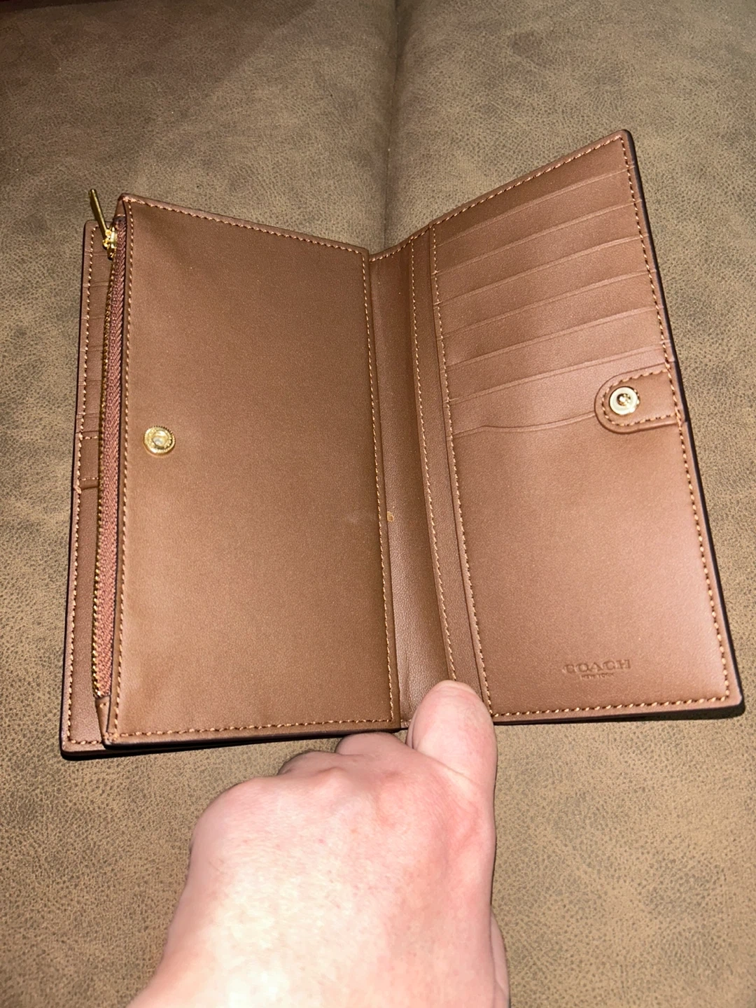 This is a Coach signature canvas tote bag with brown leather trim and a matching bifold wallet. The tote bag features a spacious interior with a zip pocket and slip pockets. The wallet has multiple card slots, a clear ID window, and a zip coin pocket. It's a classic set for everyday use!