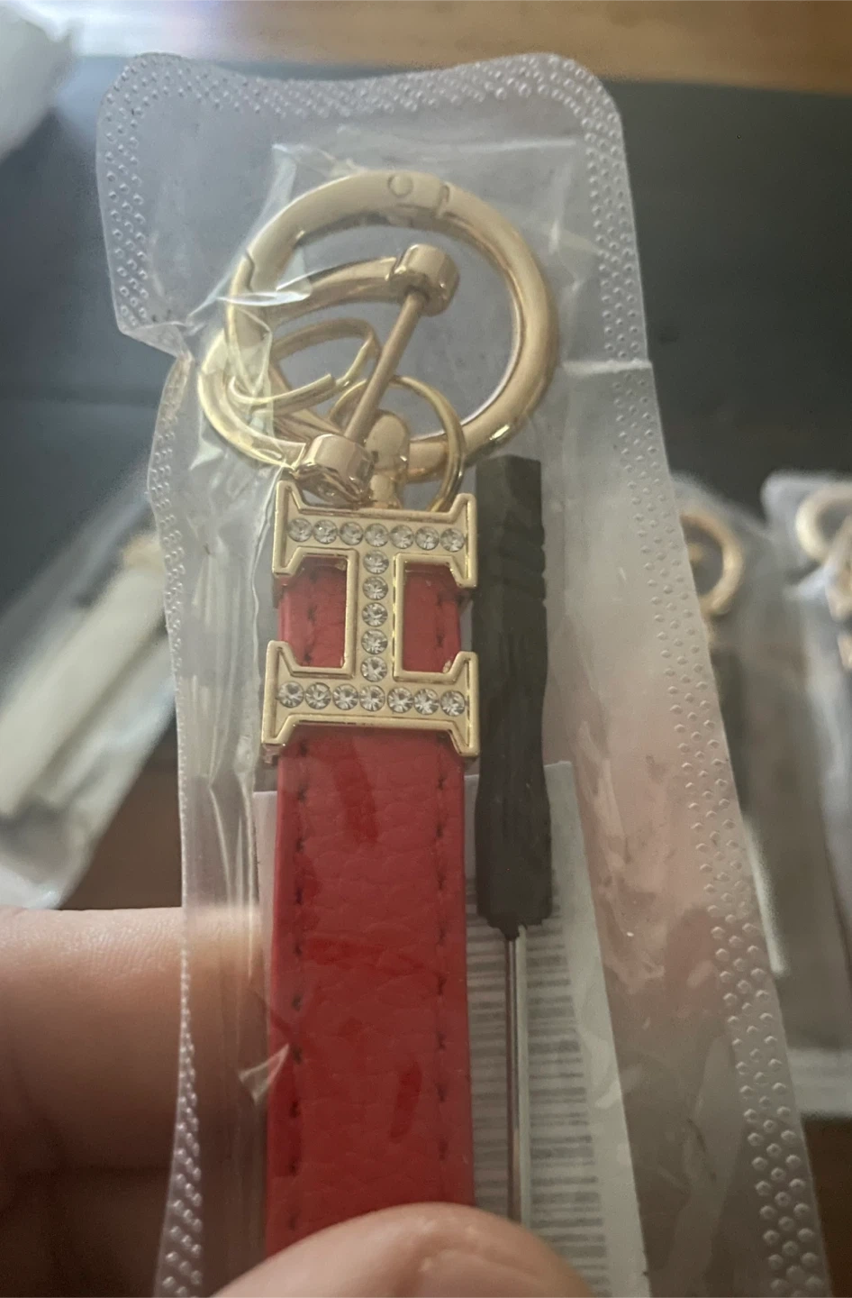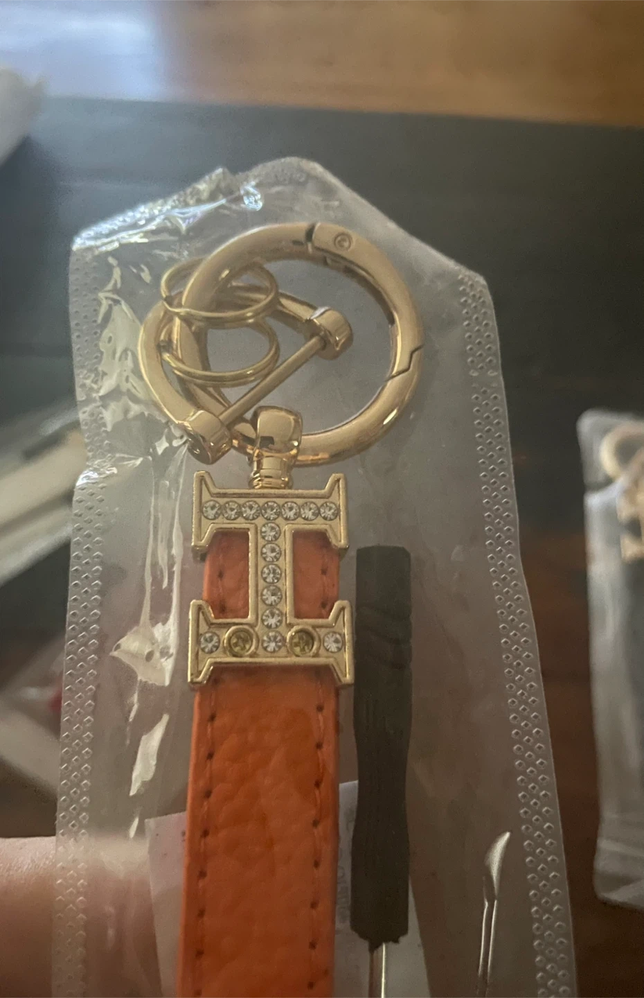 Keychain with a gold-tone clasp and a decorative charm featuring an "H" logo embellished with rhinestones. It has a leather strap available in various colours. Includes a small screwdriver.