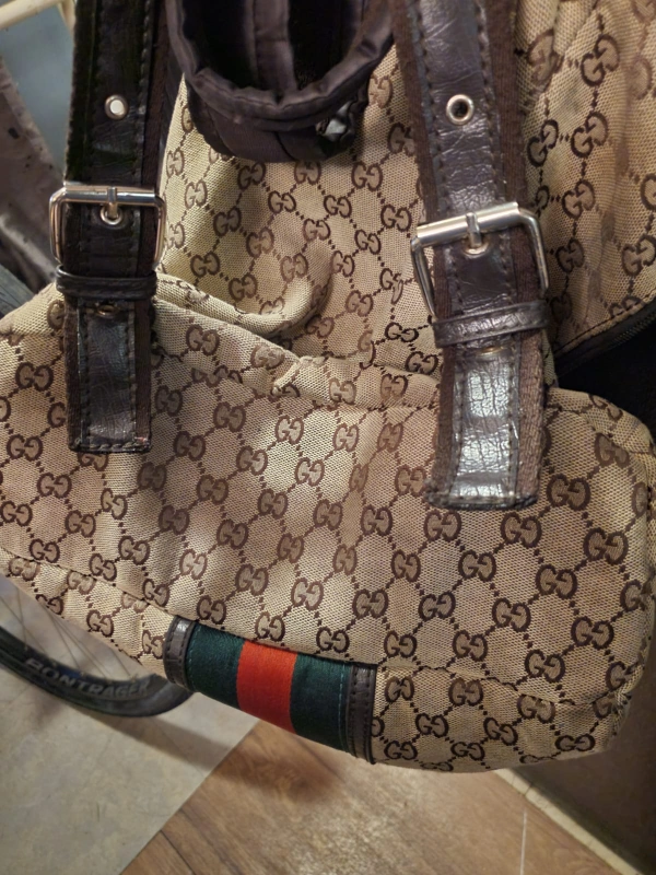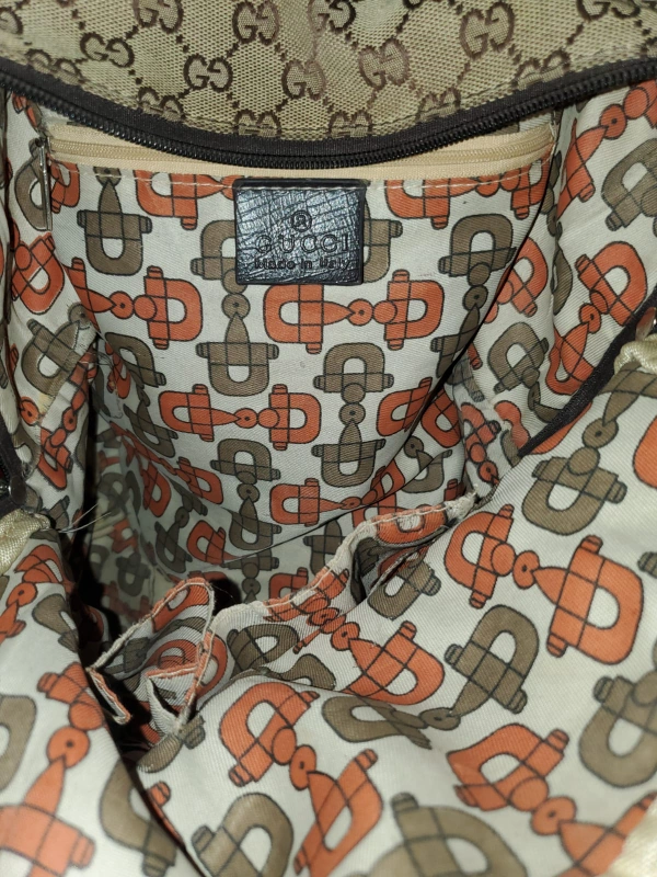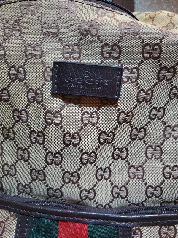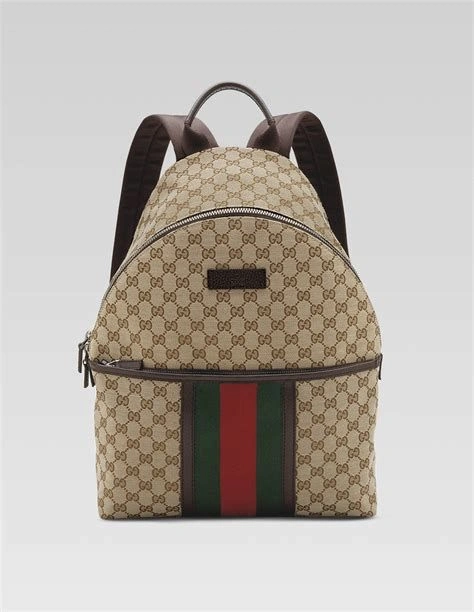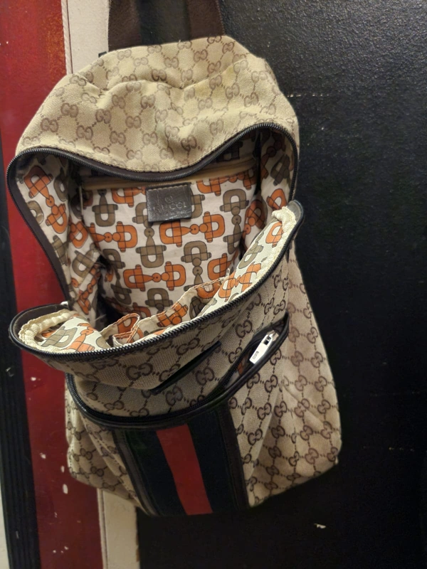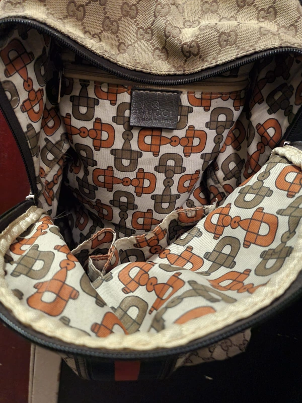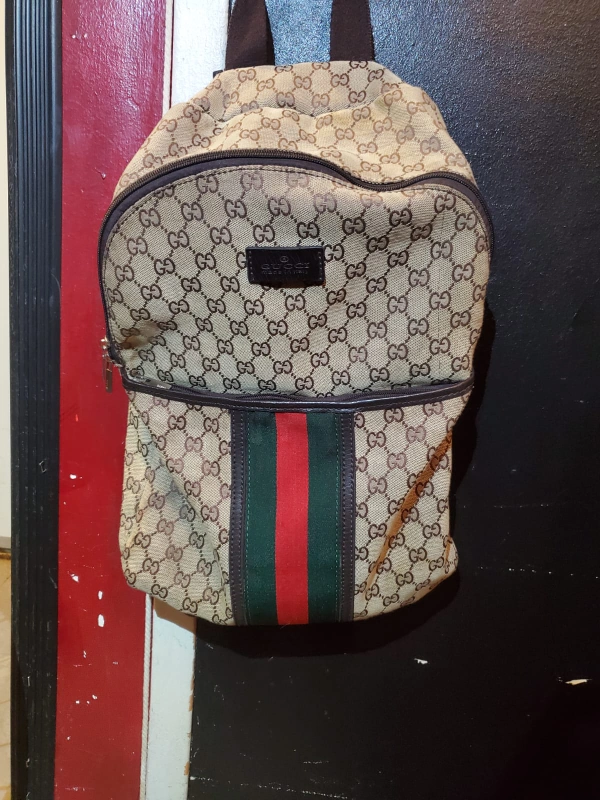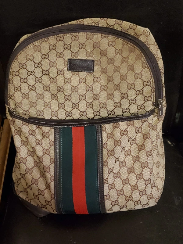 A brown and beige Gucci backpack with a red and green stripe.