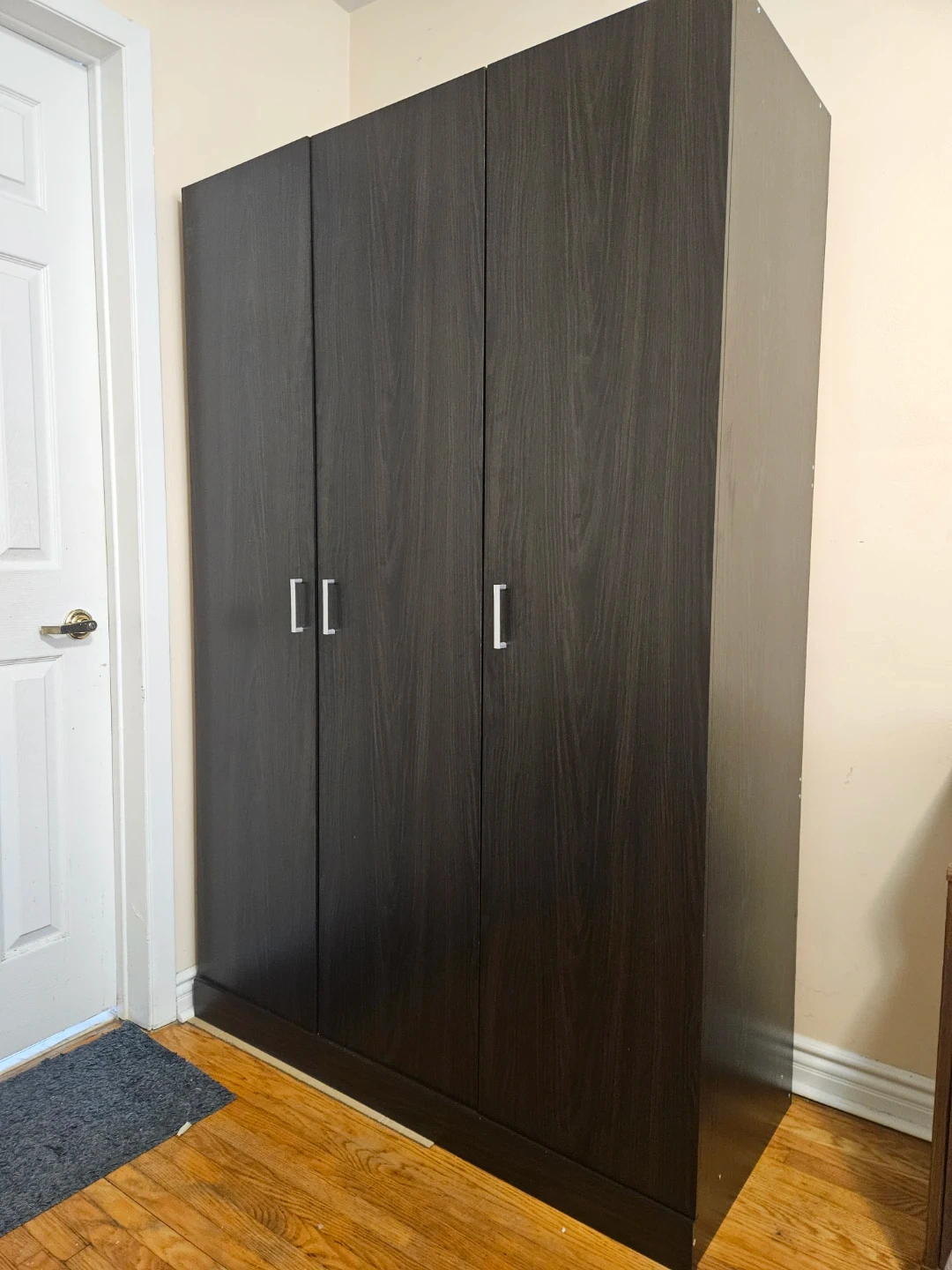 Selling a dark brown three-door wardrobe. It's in great condition and perfect for adding extra storage to any room. It has a sleek design that will fit in with most decor styles. Inside, there's a hanging rod and shelving to keep your clothes and accessories organized
