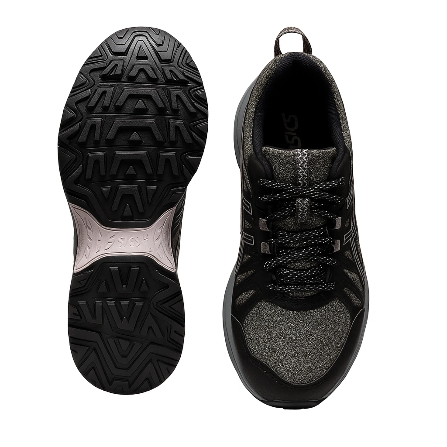 ASICS Gel-Venture 8 running shoes in black and grey. These trail running shoes feature GEL cushioning and a durable rubber outsole for traction. They're designed for active lifestyles and outdoor adventures.