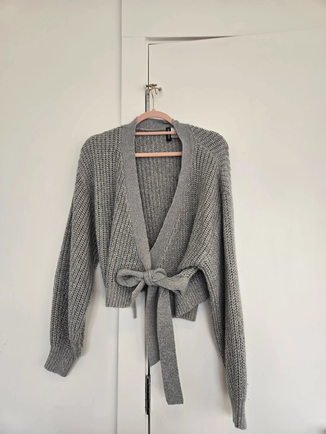 A soft grey knit wrap cardigan from Divided. It features a tie closure at the front and long sleeves. This cardigan's material is comfortable for layering.