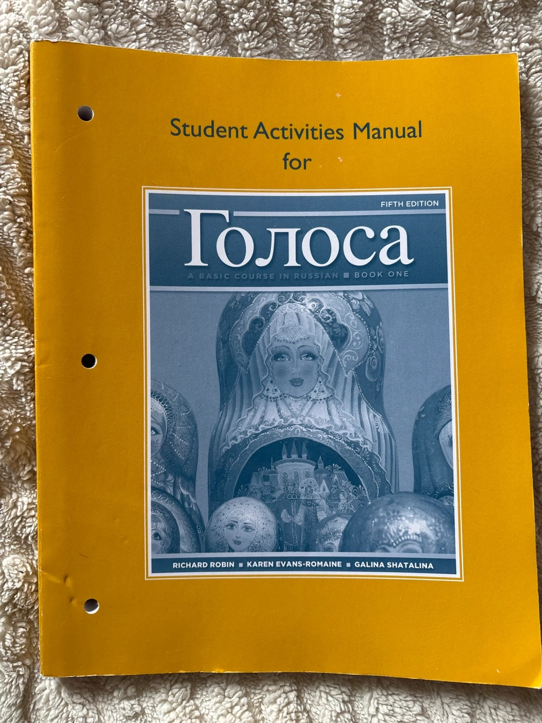 This is the fifth edition of the Golosas Student Activities Manual for Book One, a basic course in Russian. It includes activities designed for learning the Russian language. The authors are Richard Robin, Karen Evans-Romaine, and Galina Shatalina.