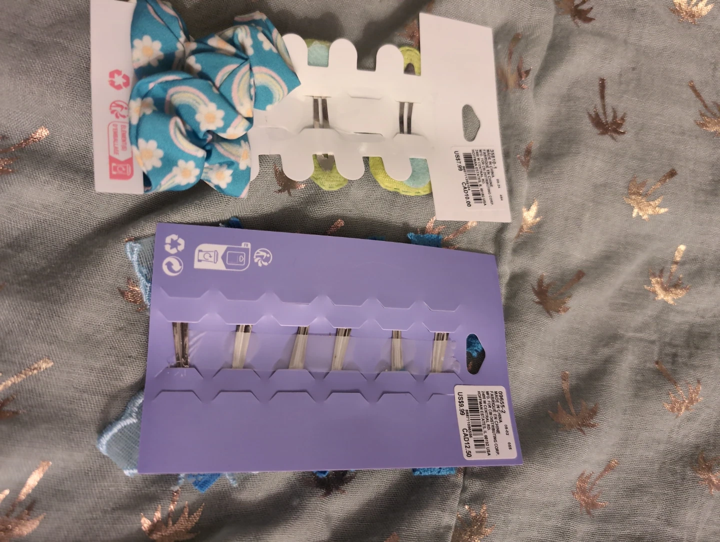 Set of hair bows and clips from Claire's Club. Includes rainbow and floral patterns with blue lace accents. Perfect for adding a pop of colour to hairstyles! In original packaging