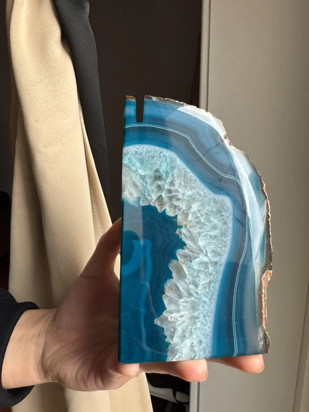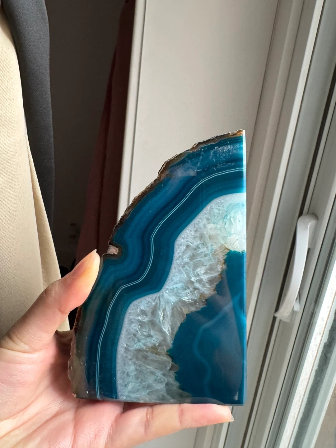 Blue and white geode slice with a natural edge and a polished green agate pyramid with small metal accents. This is a beautiful natural stone display items
