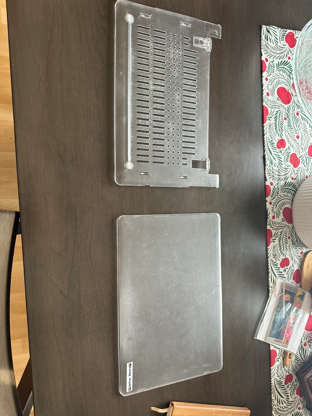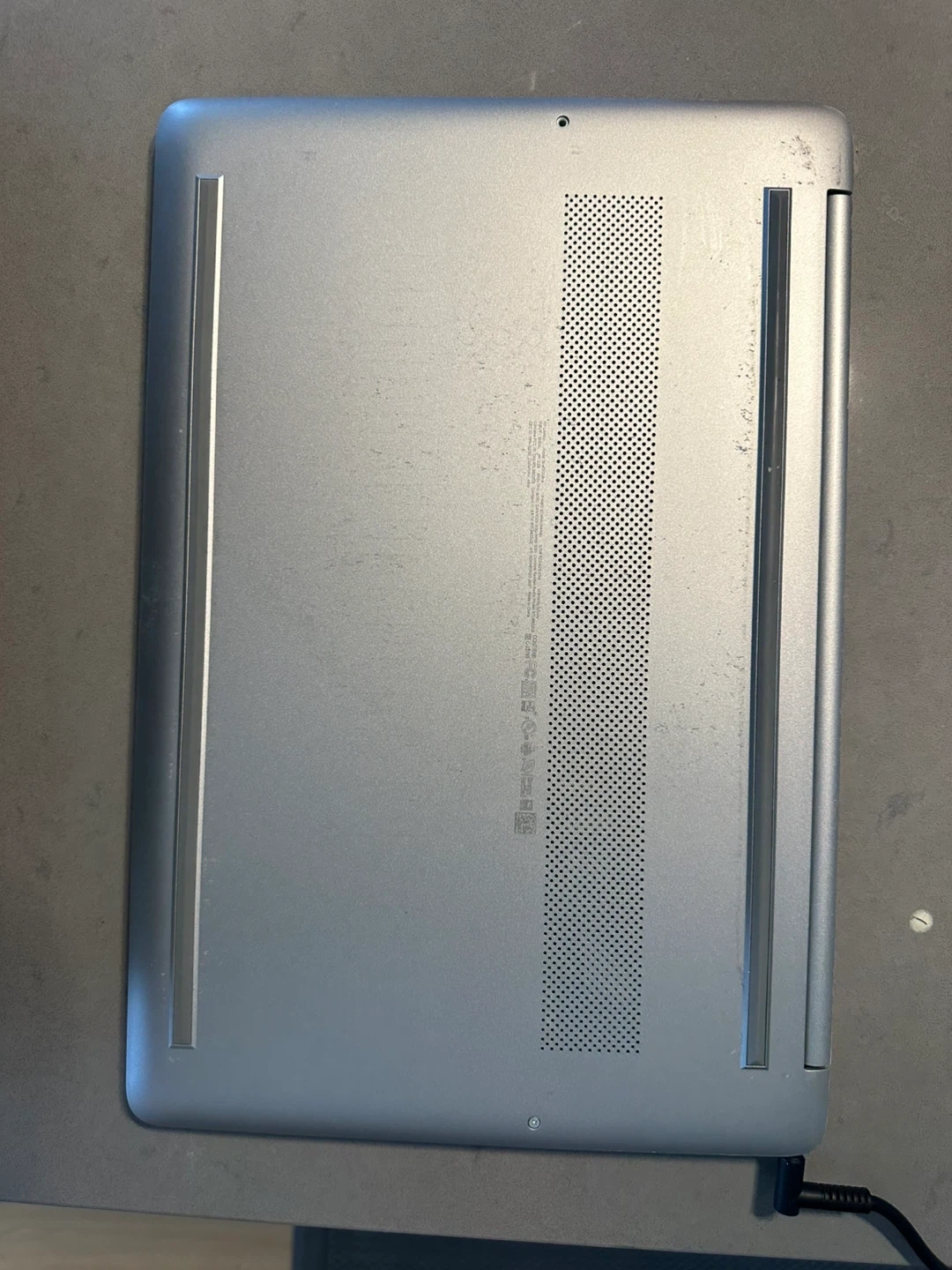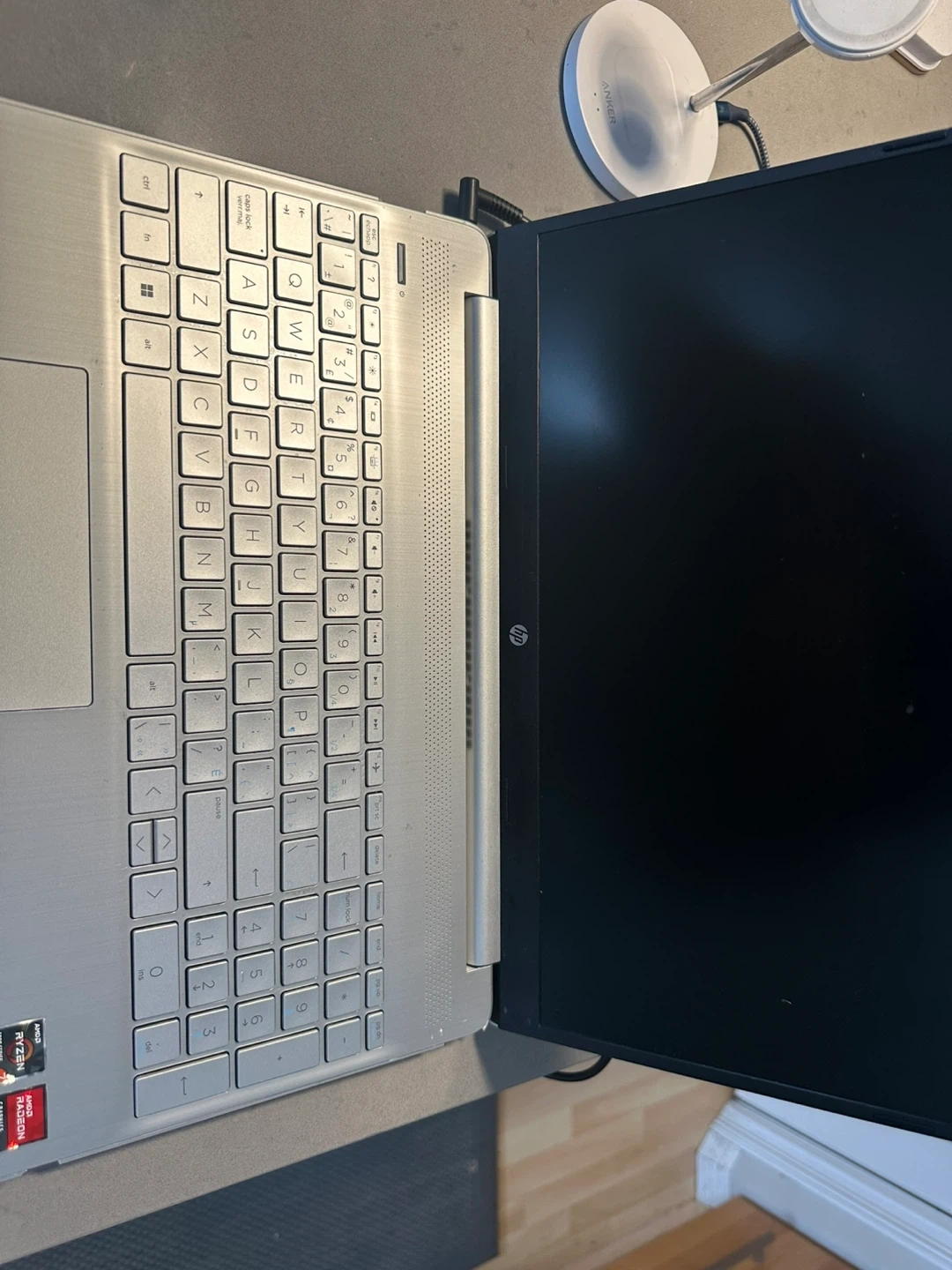This is a silver HP laptop, complete with its charger. It also includes a clear protective case for the laptop. This setup is ready for use or for someone needing a reliable device. And the specs are AMD Ryzen 7 (5000 series) and AMD Radeon graphics