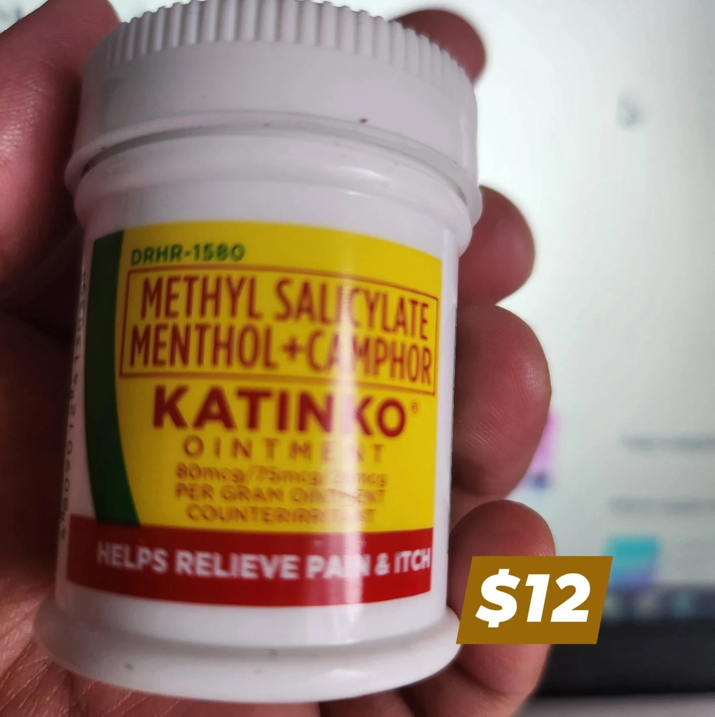 Katinko ointment contains Methyl Salicylate, Menthol, and Camphor. It helps relieve pain and itch. This is a 20g jars.