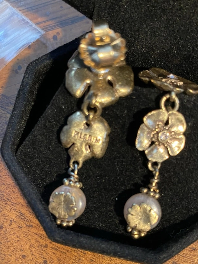Pilgrim brand dangle earrings featuring a multi-flower (clovers) design. The visible "PILGRIM" inscription on the back of one earring identifies them as being from the Danish jewelry maker known for their hand-finished, high-quality costume jewelry.