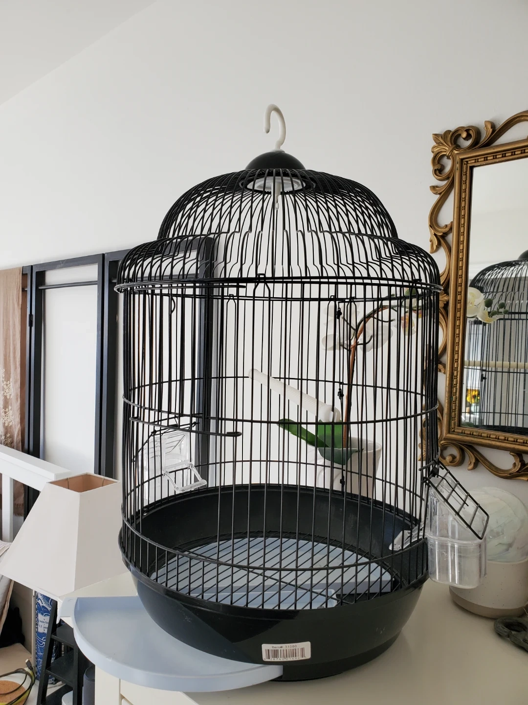 This is a black, round bird cage with a domed top. It comes with a hanging hook and two clear feeding cups. The base has a removable tray for easy cleaning.