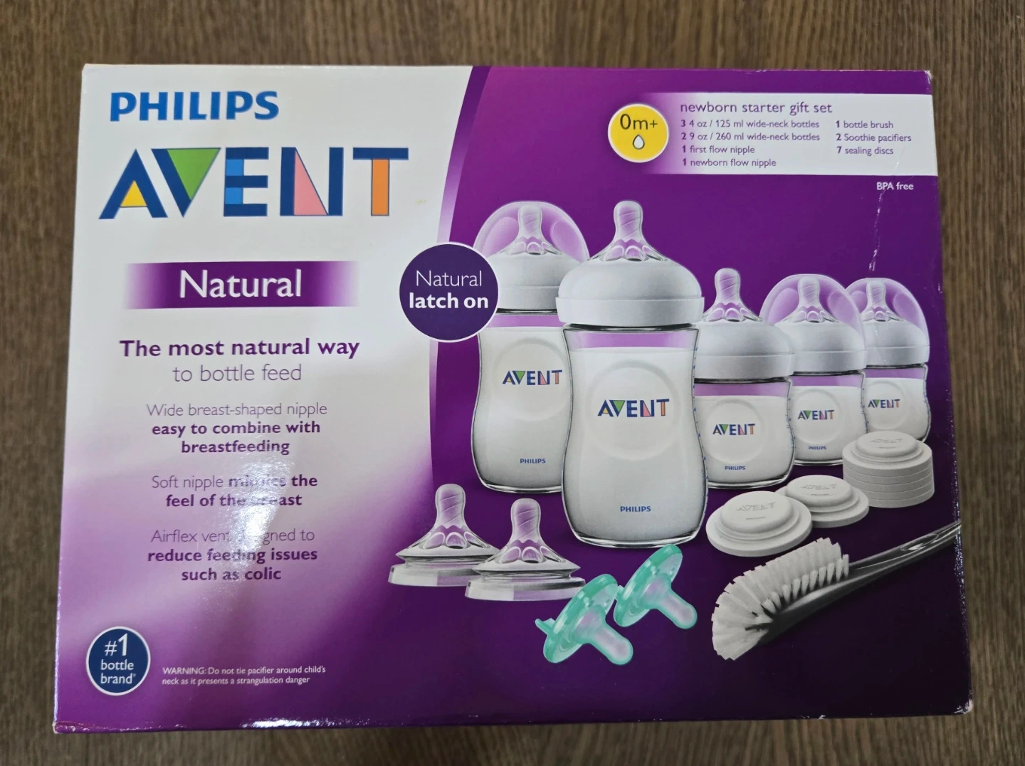 This Philips Avent Natural newborn starter gift set includes 3 x 4 oz bottles, 2 x 9 oz bottles, 1 first flow nipple, 1 newborn flow nipple, 1 bottle brush, 2 pacifiers, and 7 sealing discs. The bottles feature a wide breast-shaped nipple and an Airflex vent system designed to reduce feeding issues like colic. It's BPA free and suitable for babies 0 months and up.