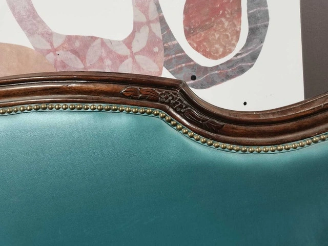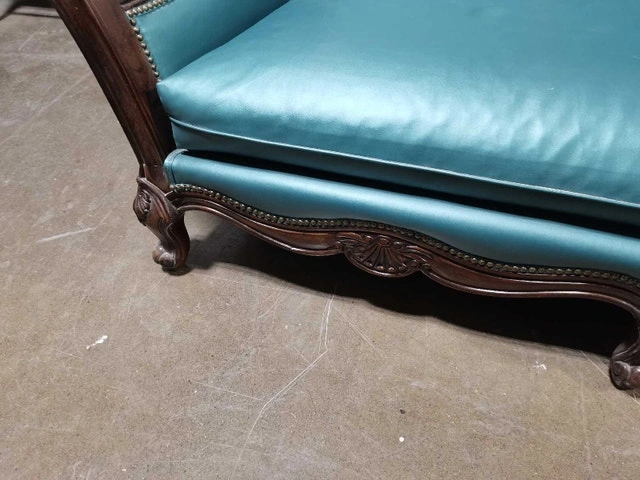 Add a touch of elegance to your living space with this eye-catching couch, featuring an ornate dark wood frame and teal fabric upholstery. This couch has a unique character. Louis Philippe sofa in mahogany wood nineteenth century the piece is super wide so require a house with double entrance door to move in. Approximate Dimensions: - Length: 88" - Width: 39" - Height: 39" Transform your home with this stunning couch! By the way, if the ad is up, it's still available!