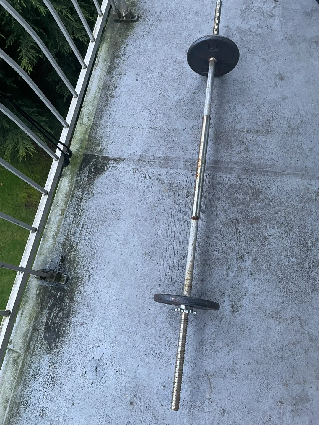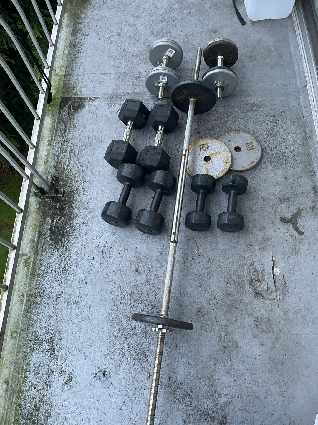 Includes two 5lb hex dumbbells, two 25lb hex dumbbells, a set of adjustable dumbbells (approx. 10-20lb each), and a barbell with weight plates. Ready for your home gym setup!