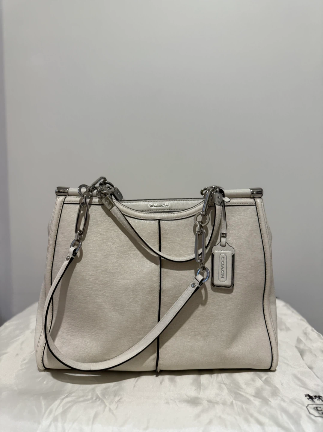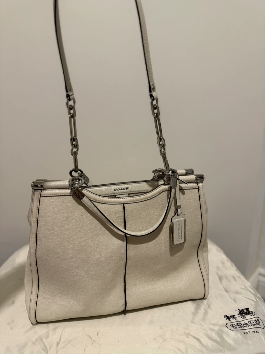 Selling a lovely Coach handbag in ivory leather. It's in great condition and comes with its original dust bag! The bag features silver-tone hardware and a structured design, perfect for everyday use or special occasions. Feel free to reach out if you have any questions!