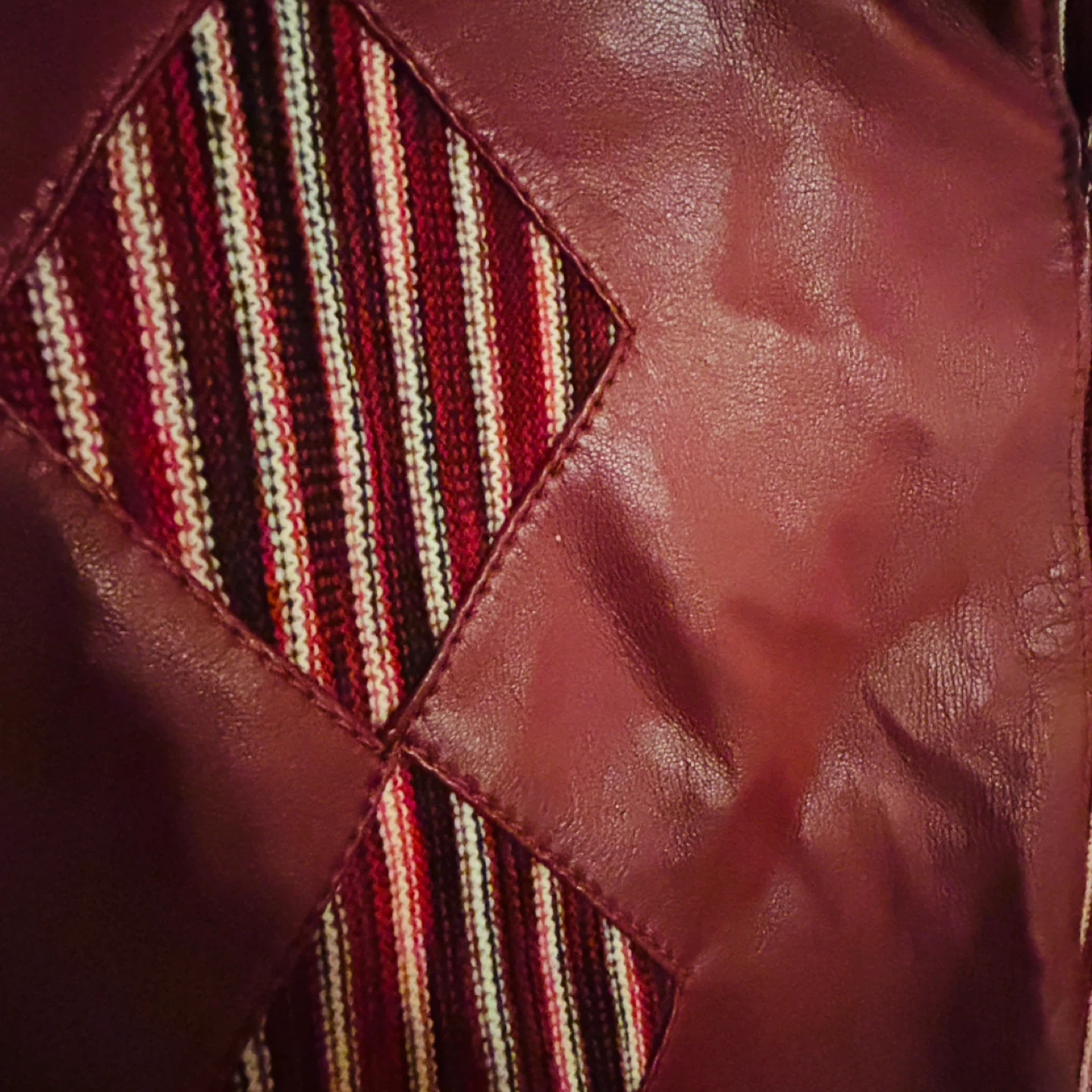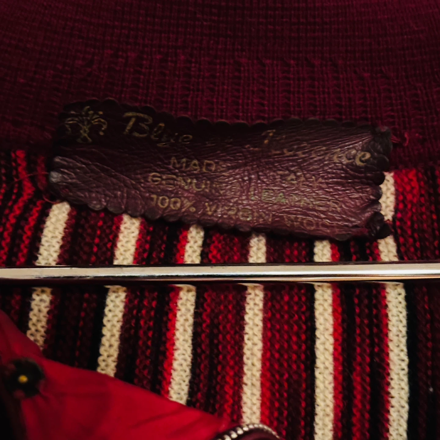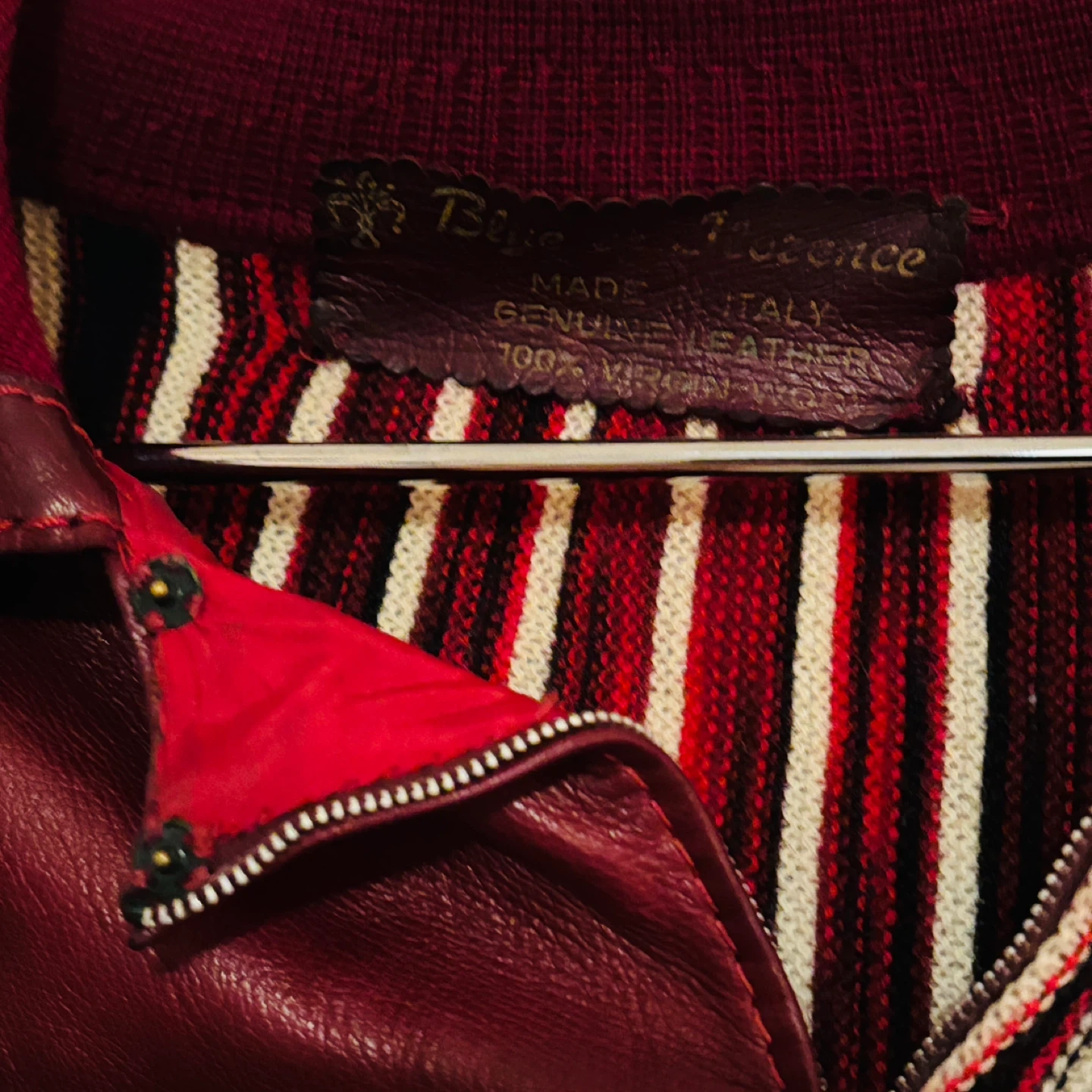 Extremely rare!!! These sell for 300-500. Made in Italy! It features genuine leather and a unique striped design in red, white, and black wool. The jacket is in great condition, with some wear in the cuffs that is unnoticeable when rolled and an easy repair.