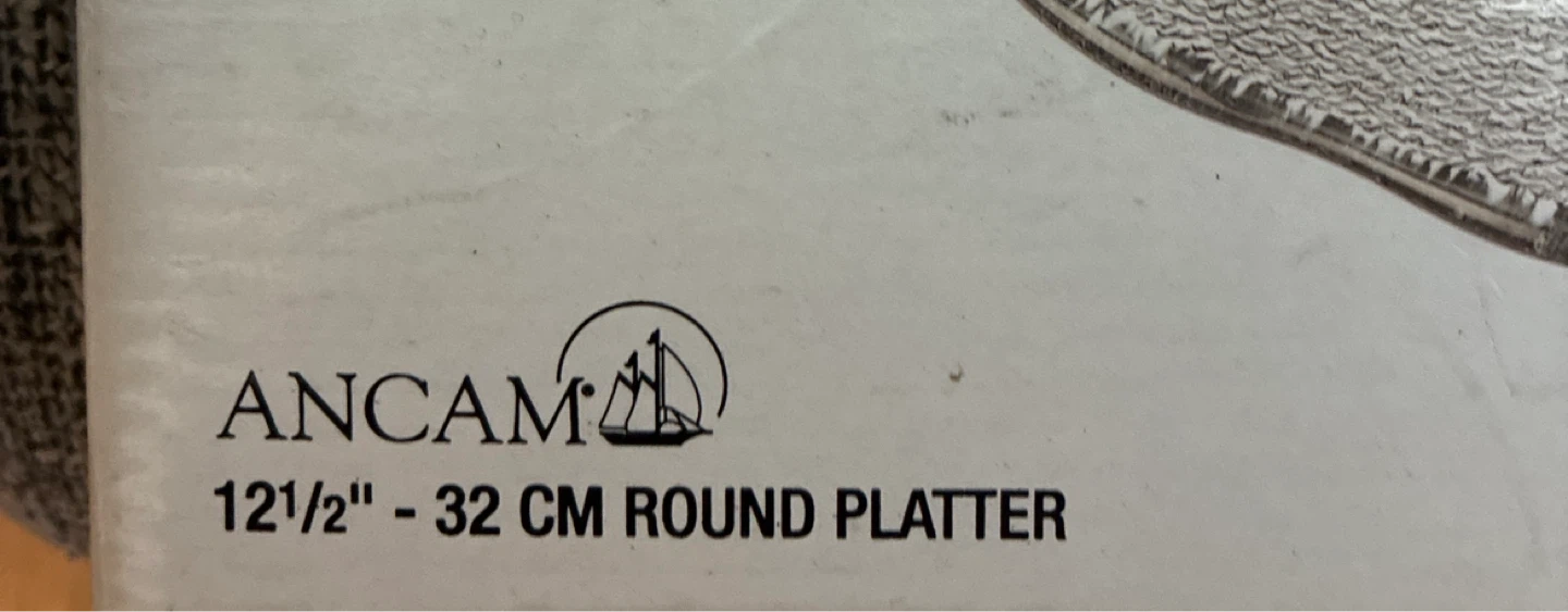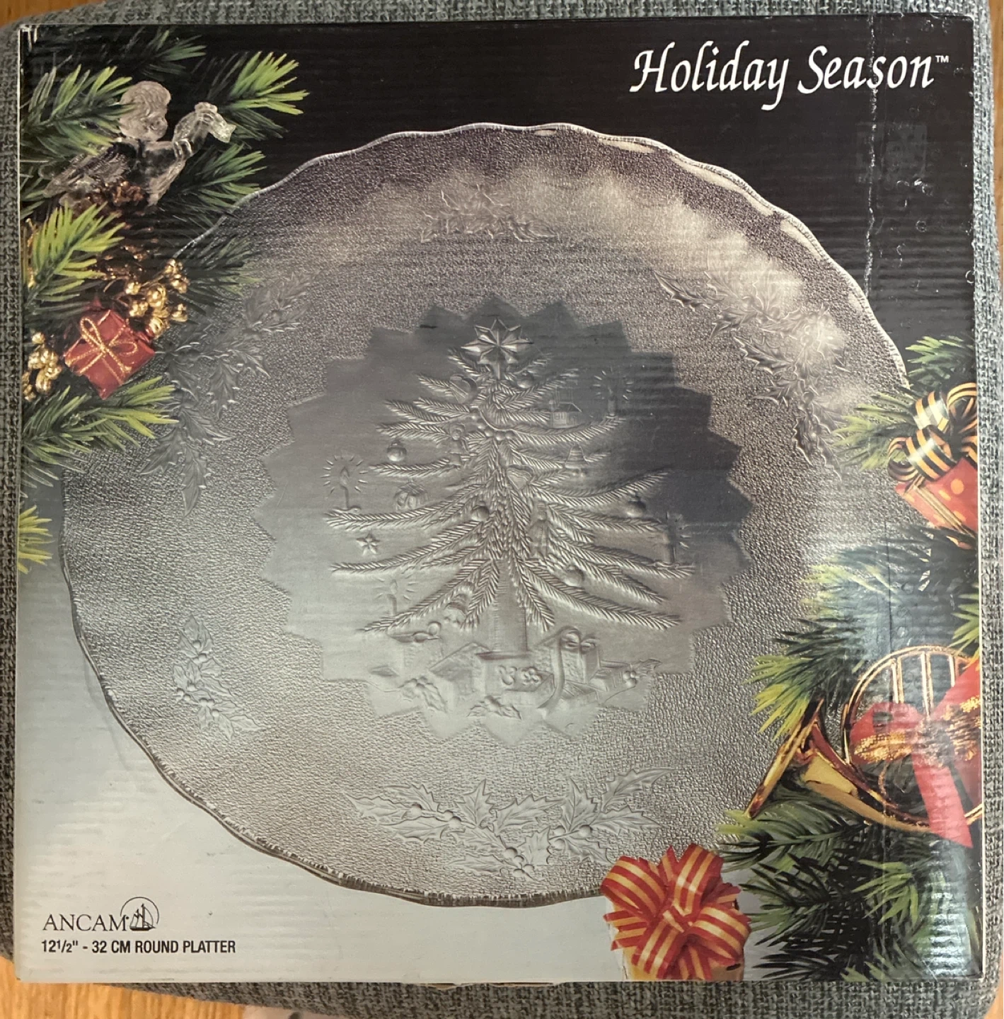 This ANCAM Holiday Season platter features a festive Christmas tree design embossed on clear glass. It's 12 1/2 inches or 32 cm in diameter, perfect for serving holiday treats. Its elegant design makes it a lovely addition to any holiday table setting!