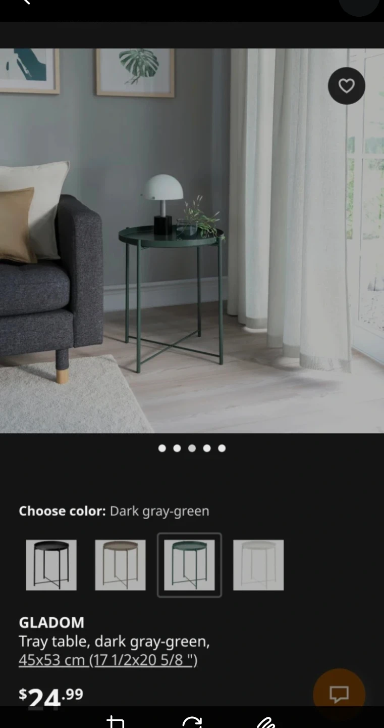 This is the IKEA GLADOM tray table in the dark gray-green colour. It's 45x53 cm (17 1/2x20 5/8 "). This table is handy for quick needs.