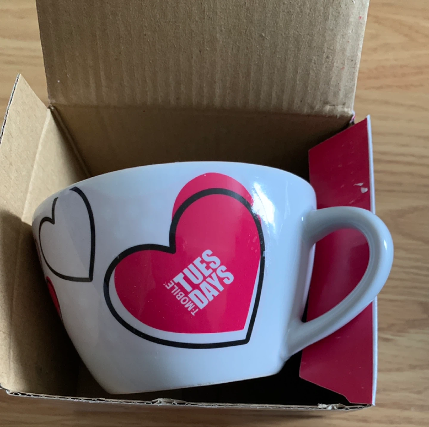 This is a T-Mobile Tuesdays mug with a heart design. It comes in its original box. It's a nice way to enjoy your morning coffee or tea!