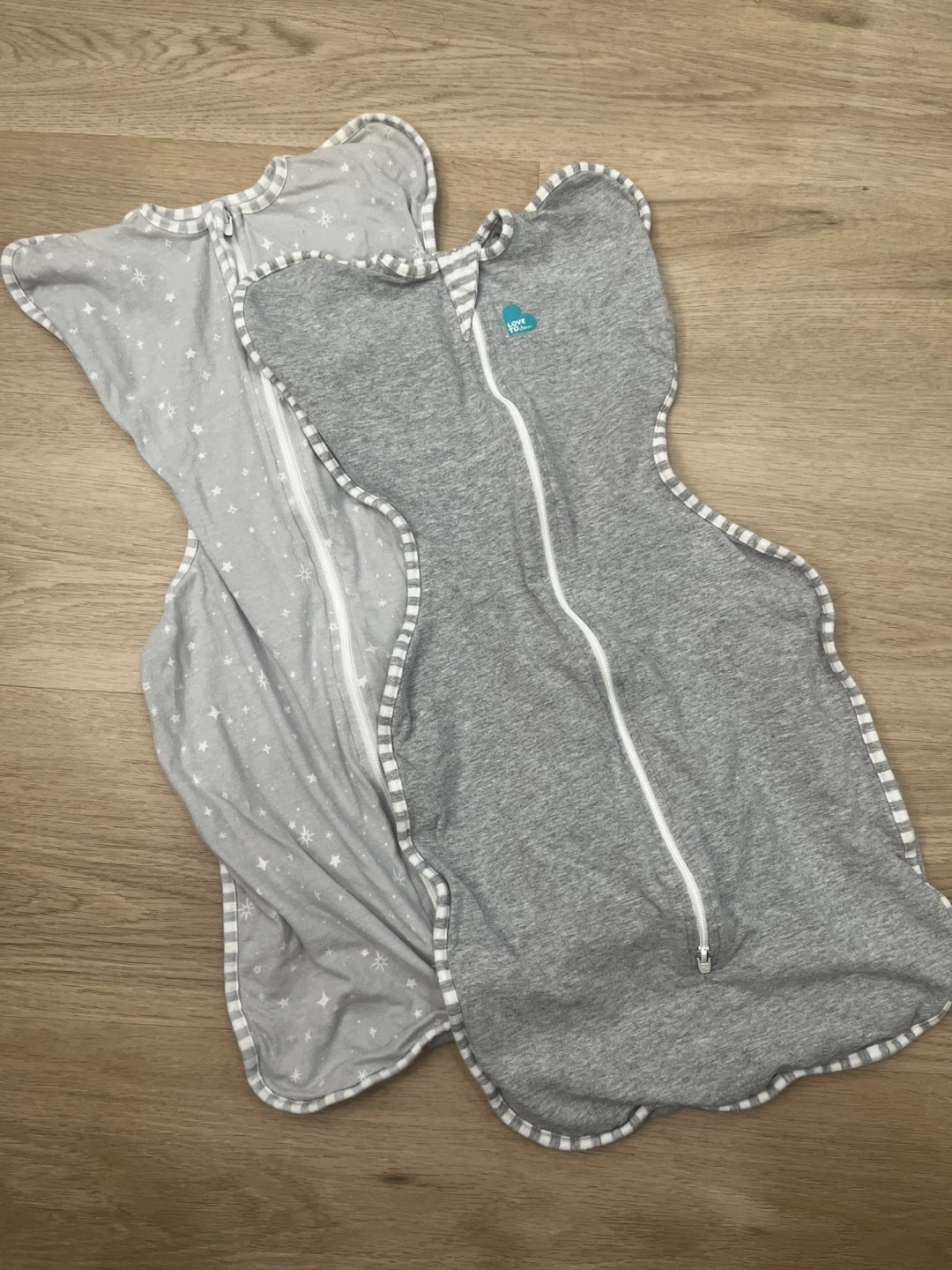 Two Love To Dream Swaddle UP sleep bags, 1.0 Tog. One in grey with white stars, the other solid grey with white stripes. They're zippered for easy use. Perfect for helping baby sleep soundly!