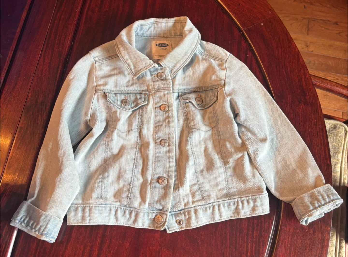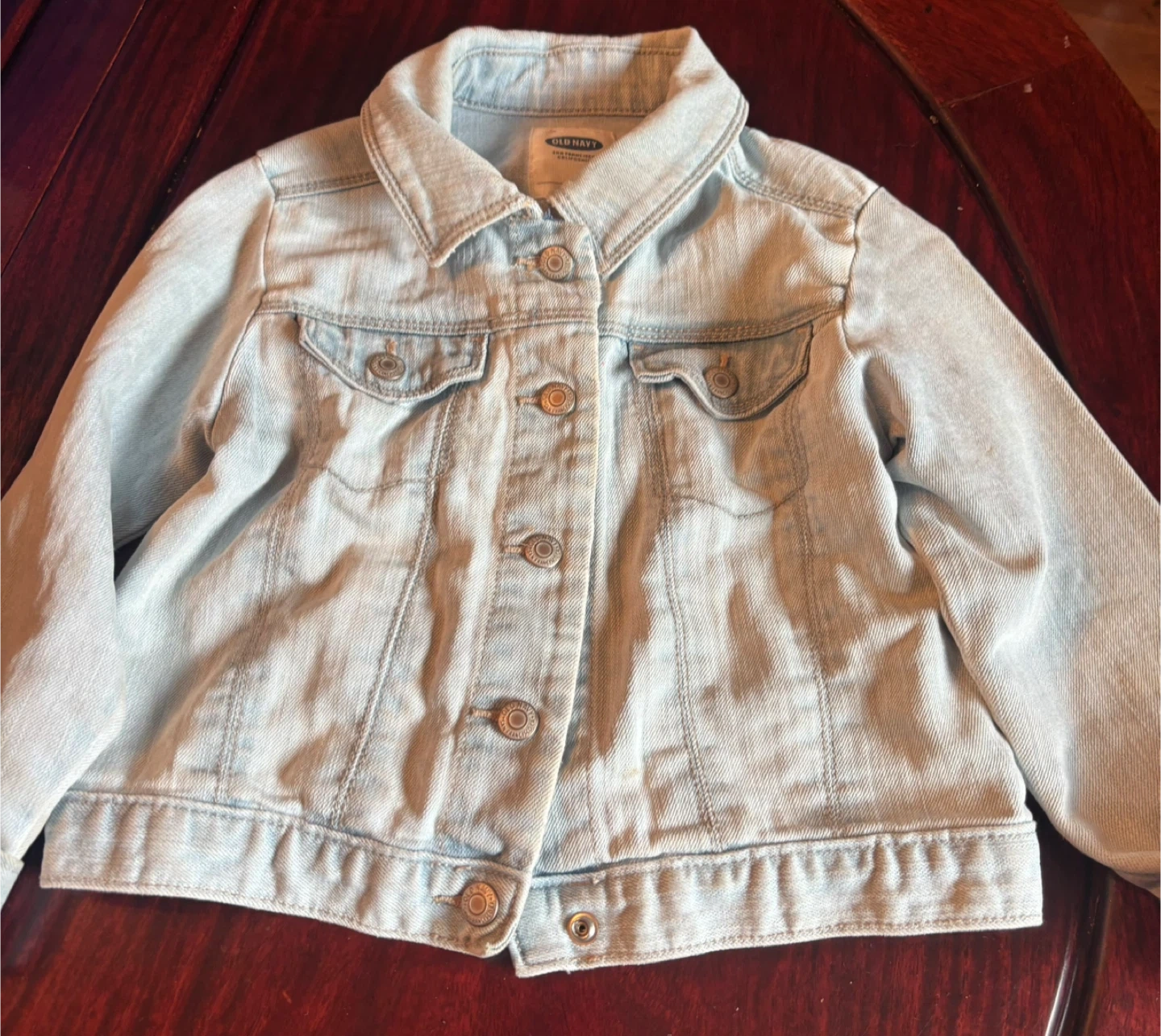 Old Navy light wash denim jacket for toddlers. It's a size 3T and made in Bangladesh. This classic jacket is great for layering over any outfit!