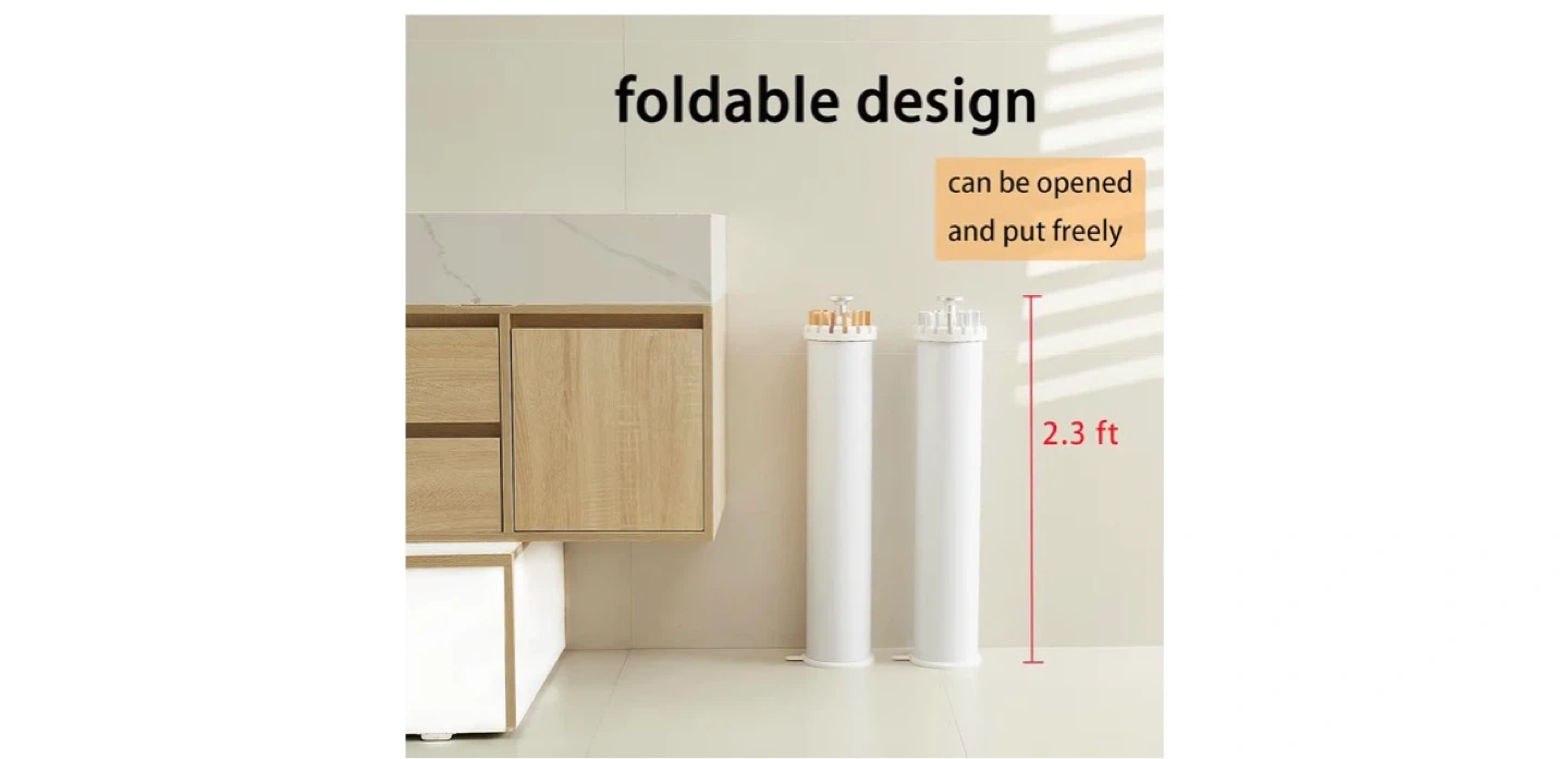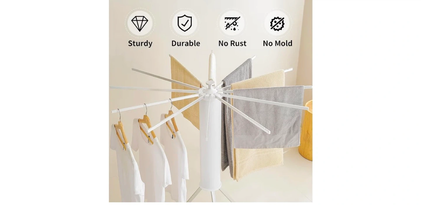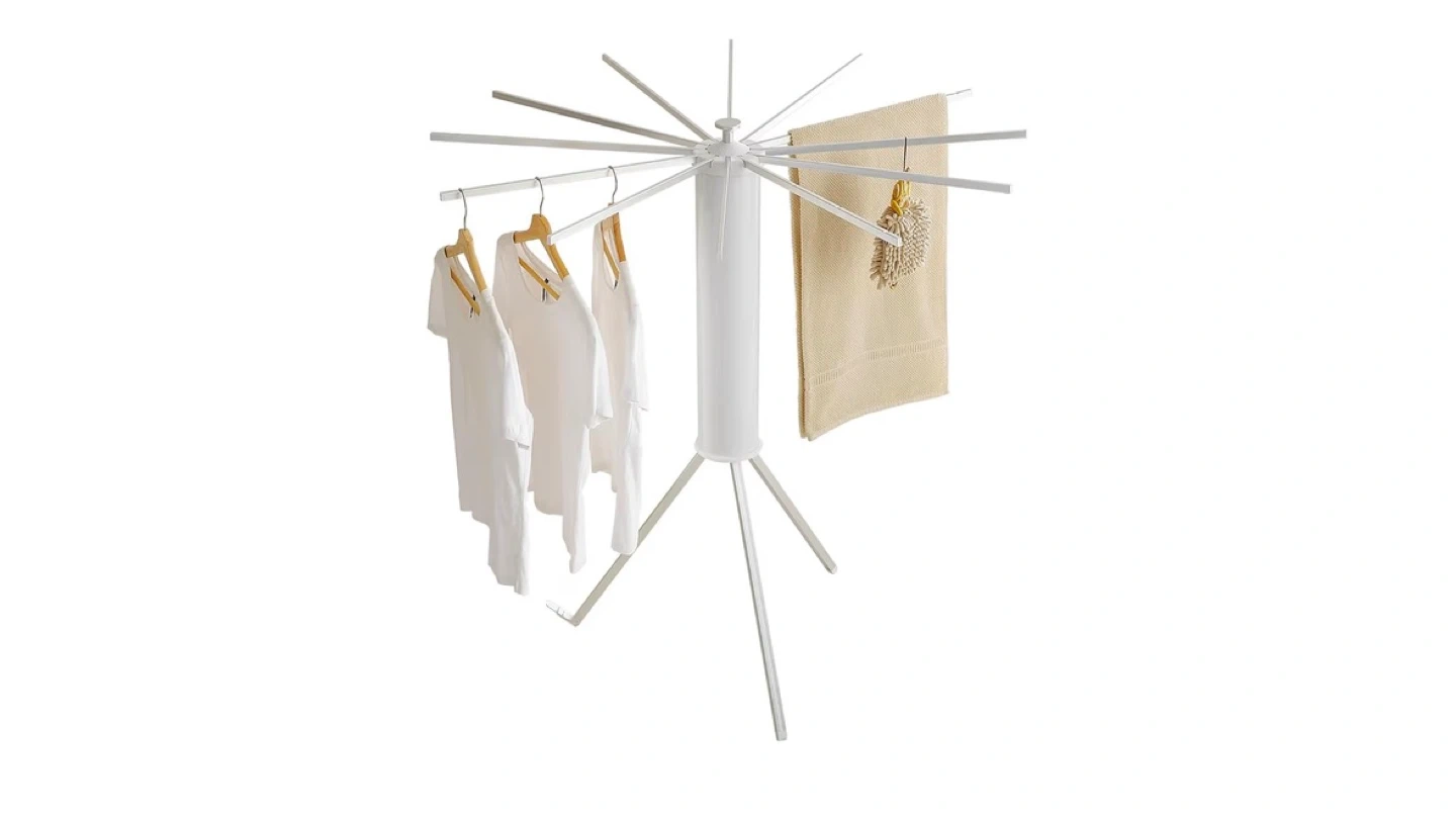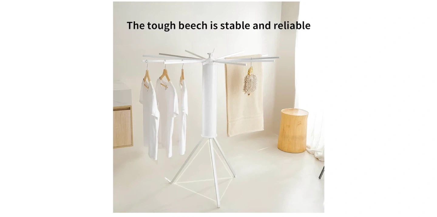 A white foldable drying rack with a sturdy and durable design. It's made from tough beech and is stable. The rack stands 2.3 ft tall and can be opened and put freely. This rack is rust and mold-free, making it great for drying clothes and towels!