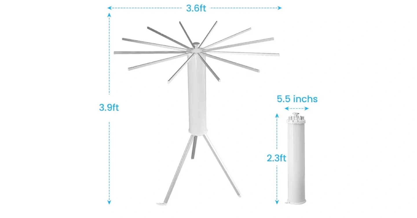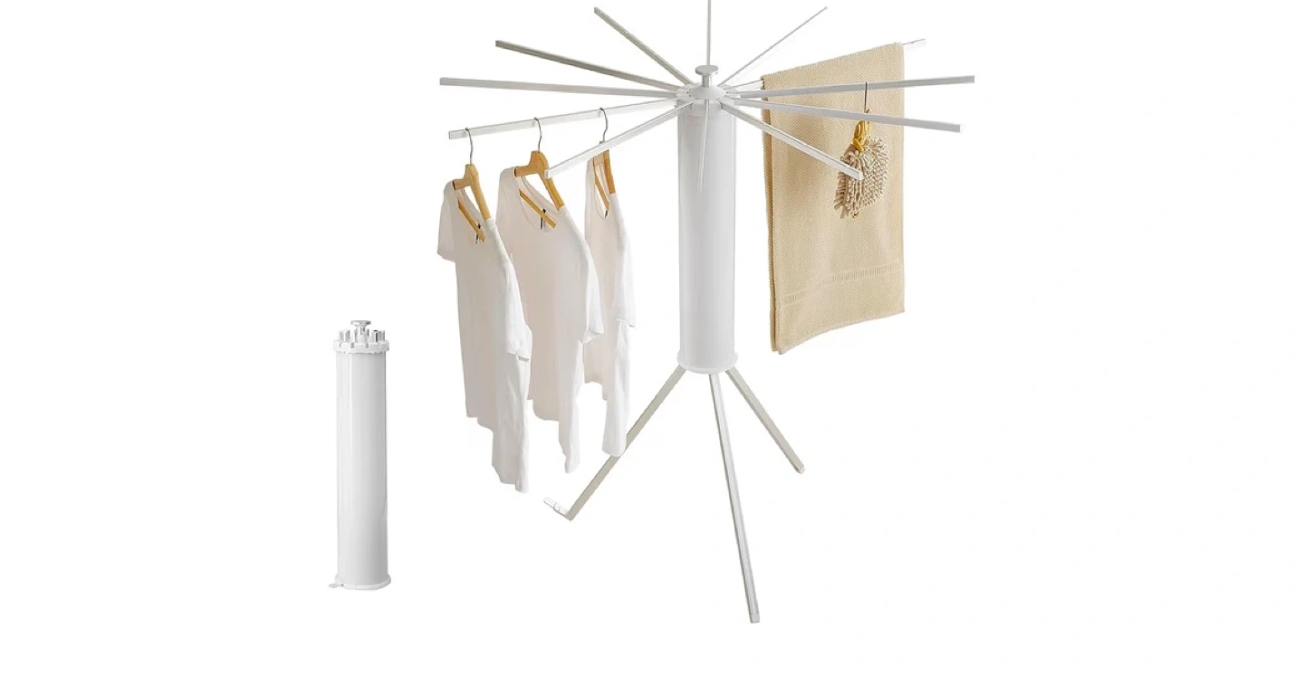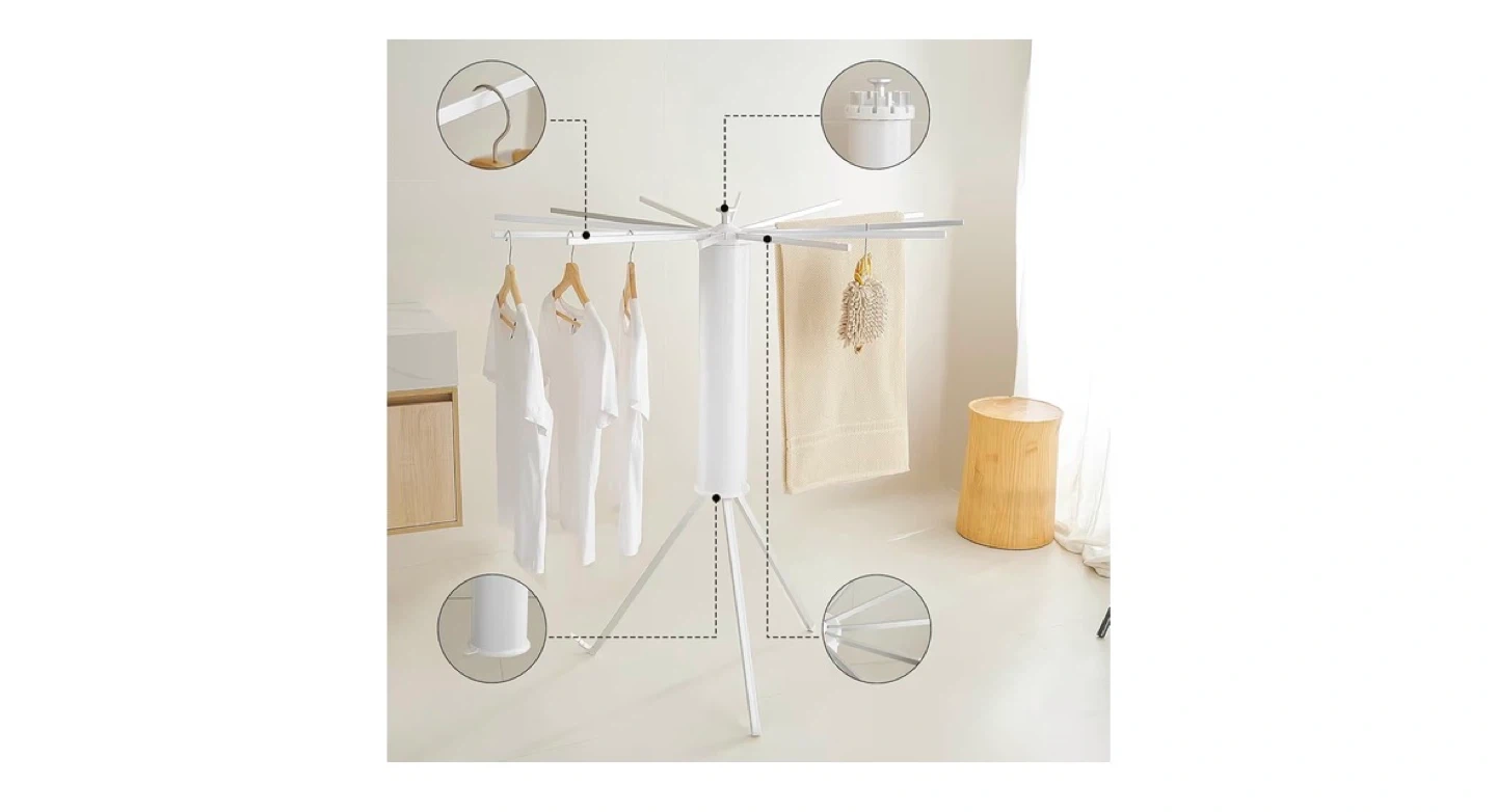A white foldable drying rack with a sturdy and durable design. It's made from tough beech and is stable. The rack stands 2.3 ft tall and can be opened and put freely. This rack is rust and mold-free, making it great for drying clothes and towels!