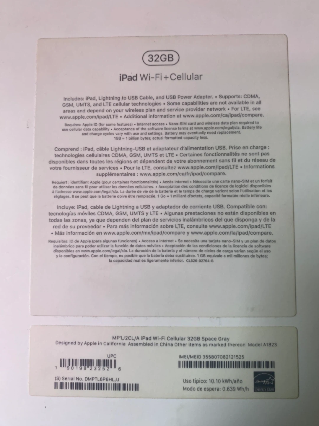 Apple iPad Wi-Fi+Cellular 32GB in Space Gray. Includes Lightning to USB Cable and USB Power Adapter. Model A1823.