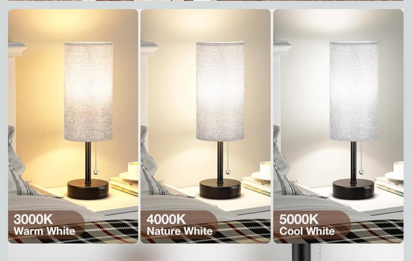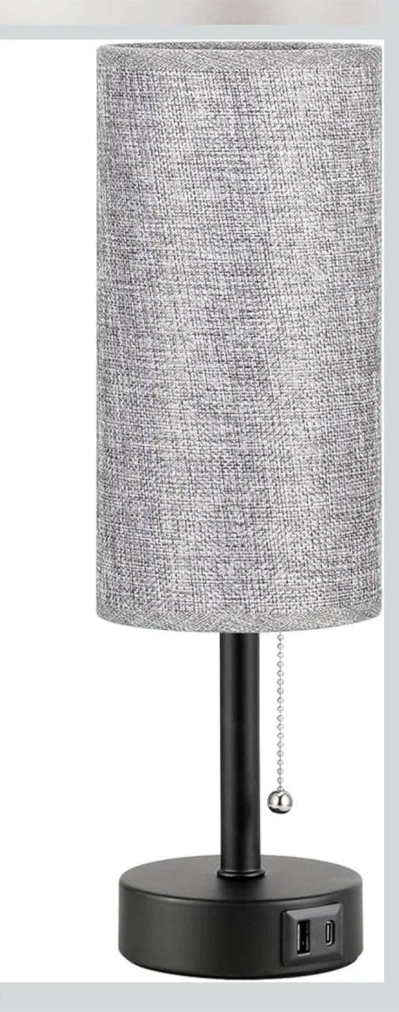 This small bedside table lamp is perfect for adding a touch of light to your bedroom or living space. It features a sleek design with a grey fabric shade and a black base. It also has built-in USB ports for convenient charging of your devices. The lamp provides adjustable lighting with warm white, nature white, and cool white options.