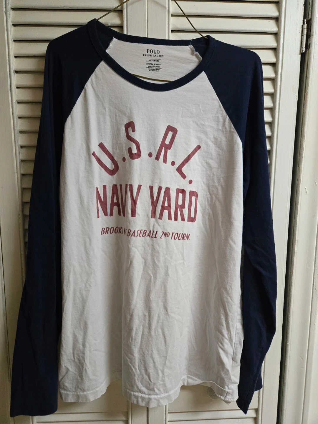 Polo Ralph Lauren long sleeve t-shirt with a custom slim fit. Features a U.S.R.L. Navy Yard Brooklyn Baseball 2nd Tour graphic. Made in the Philippines.