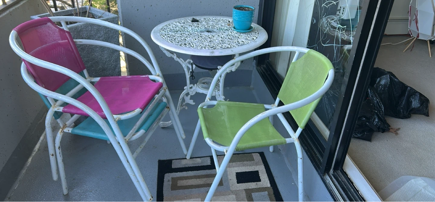 This set includes three colourful outdoor chairs in pink, teal, and green, along with a white metal bistro table. They're perfect for a small patio or balcony space. The chairs are made of metal with fabric seats. Chairs are stackable.