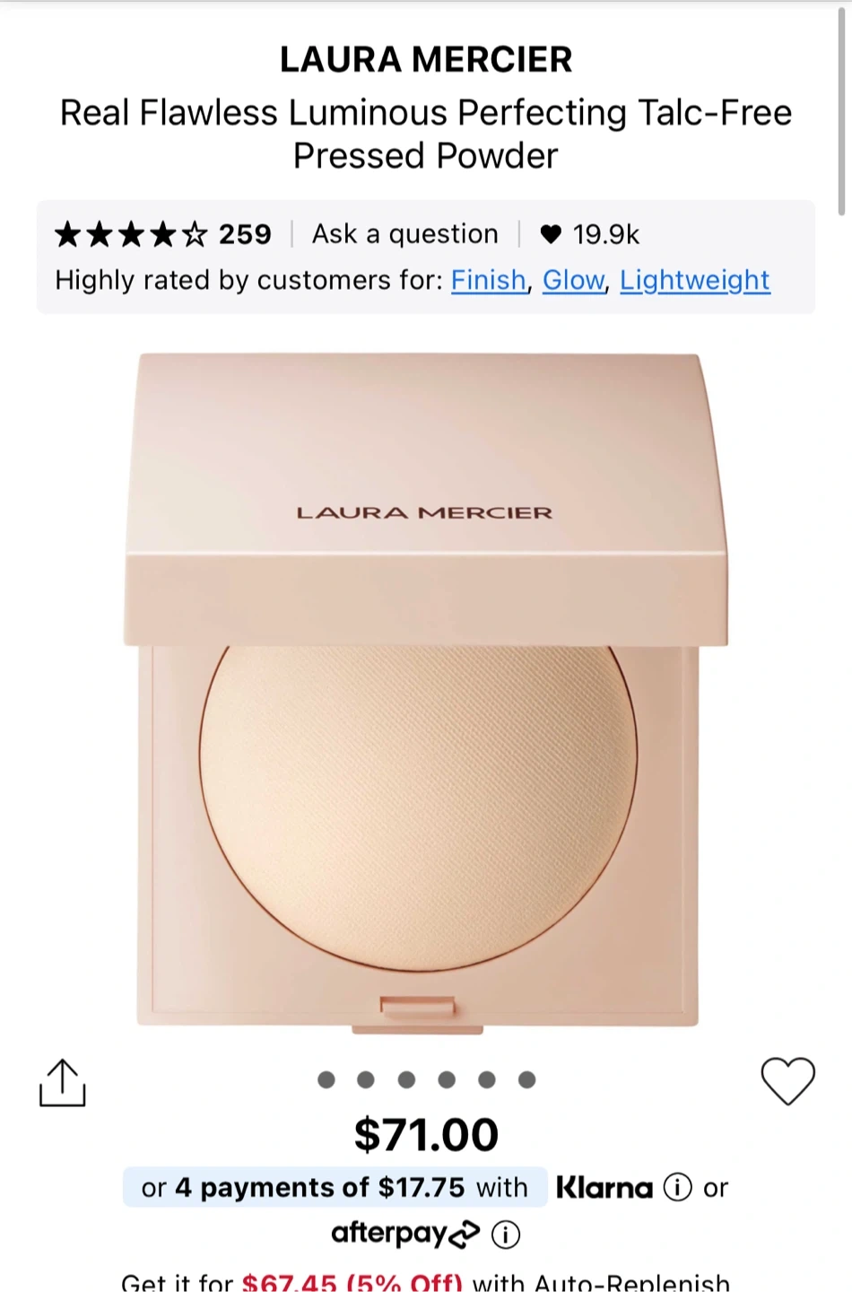 Laura Mercier Real Flawless Luminous Perfecting Pressed Powder in Translucent. Contains 7 g / 0.24 oz of product. It's a talc-free formula that provides a perfected, luminous finish.