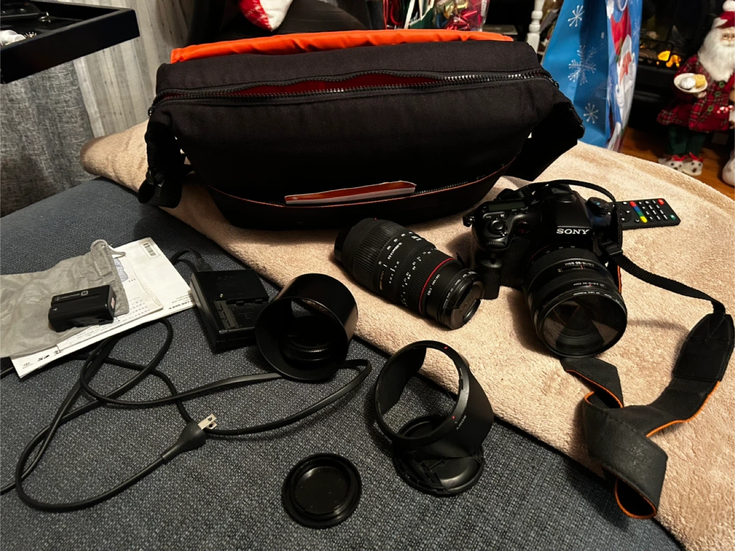 Selling a Sony SLT-A77V camera body along with a Sigma APO DG 70-300mm 1:4-5.6 lens. Also included is a Sony SAL1850 18-50mm lens. It comes with a camera bag, battery, charger, lens hood and UV lens protector. Great setup for photography enthusiasts!