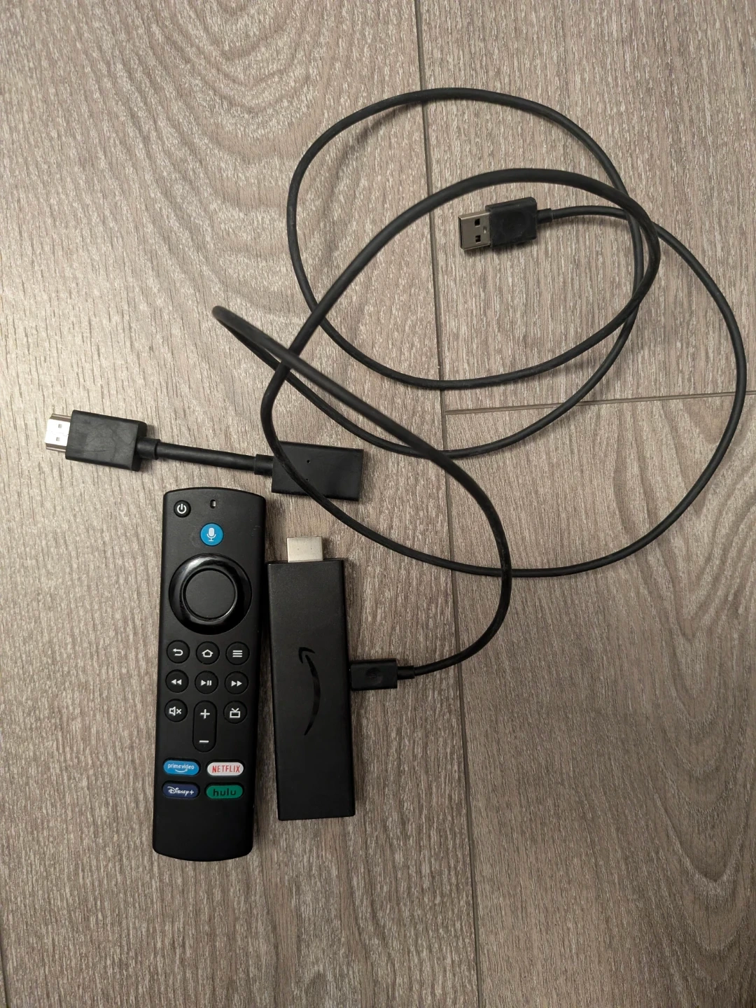 This is an Amazon Fire TV Stick 4K. It comes with a remote control and power cable but without the power adapter. You will need a USB A power adapter to use this.