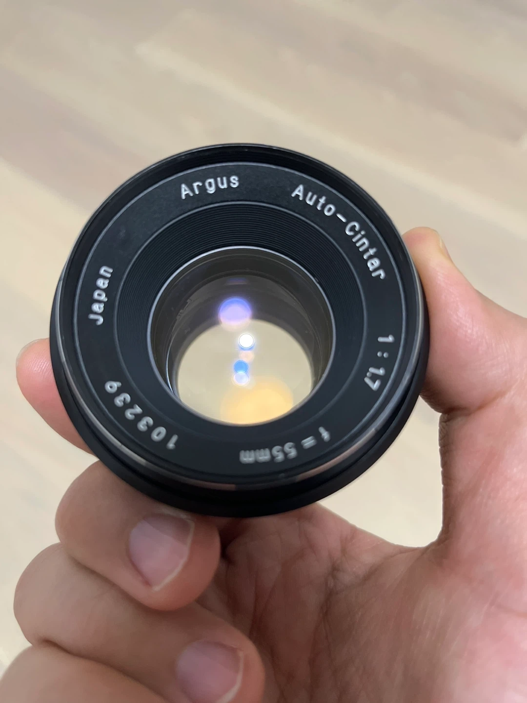 This is an Argus Auto-Cintar camera lens. It has a focal length of 55mm and an aperture of f/1.7, m42. Manufactured in Japan.