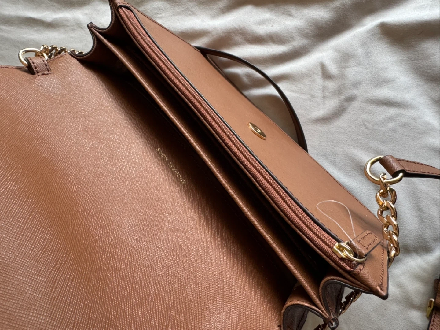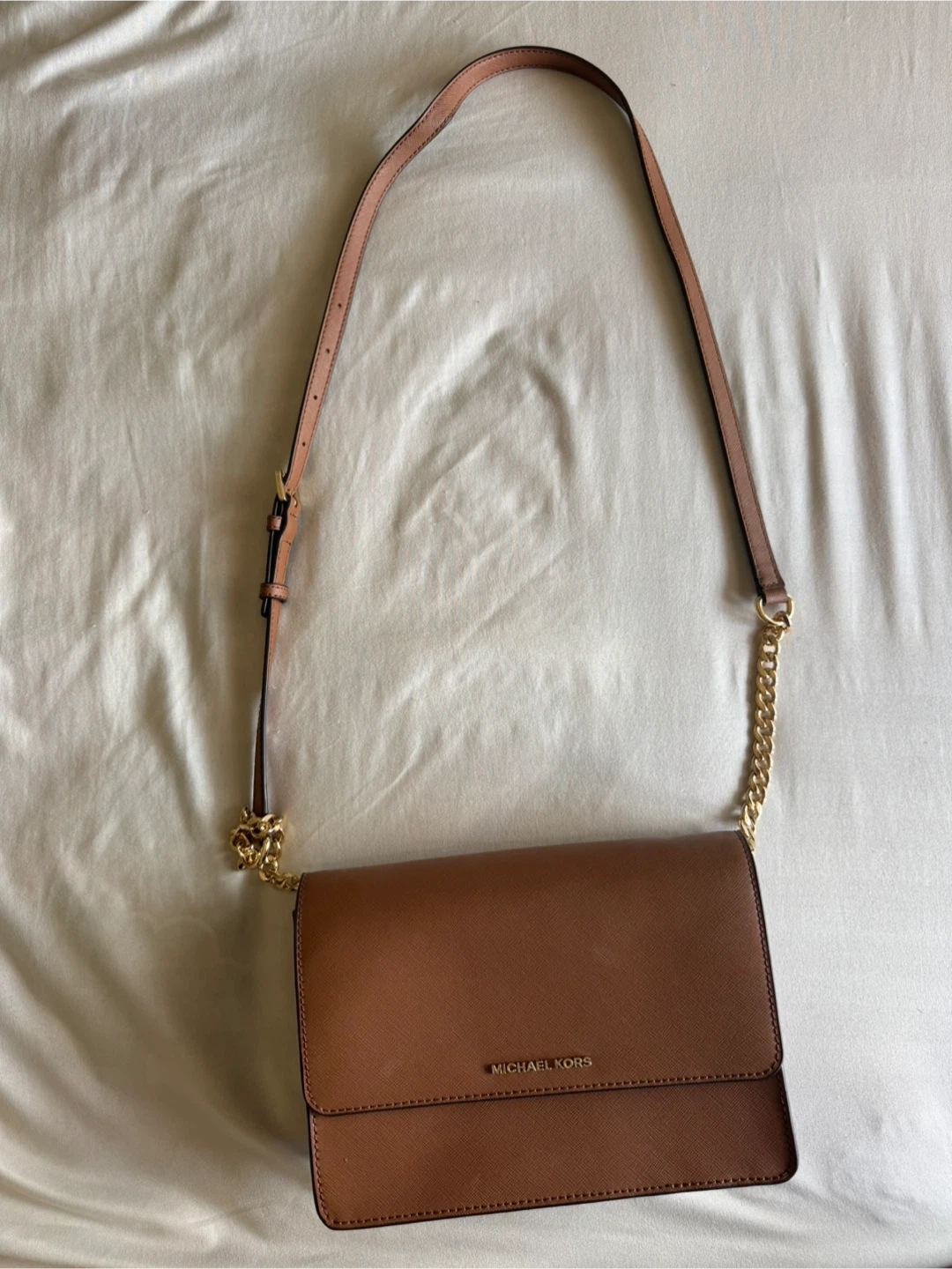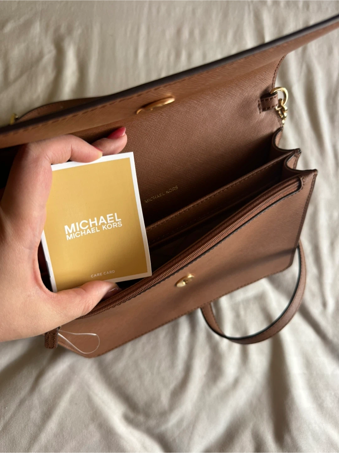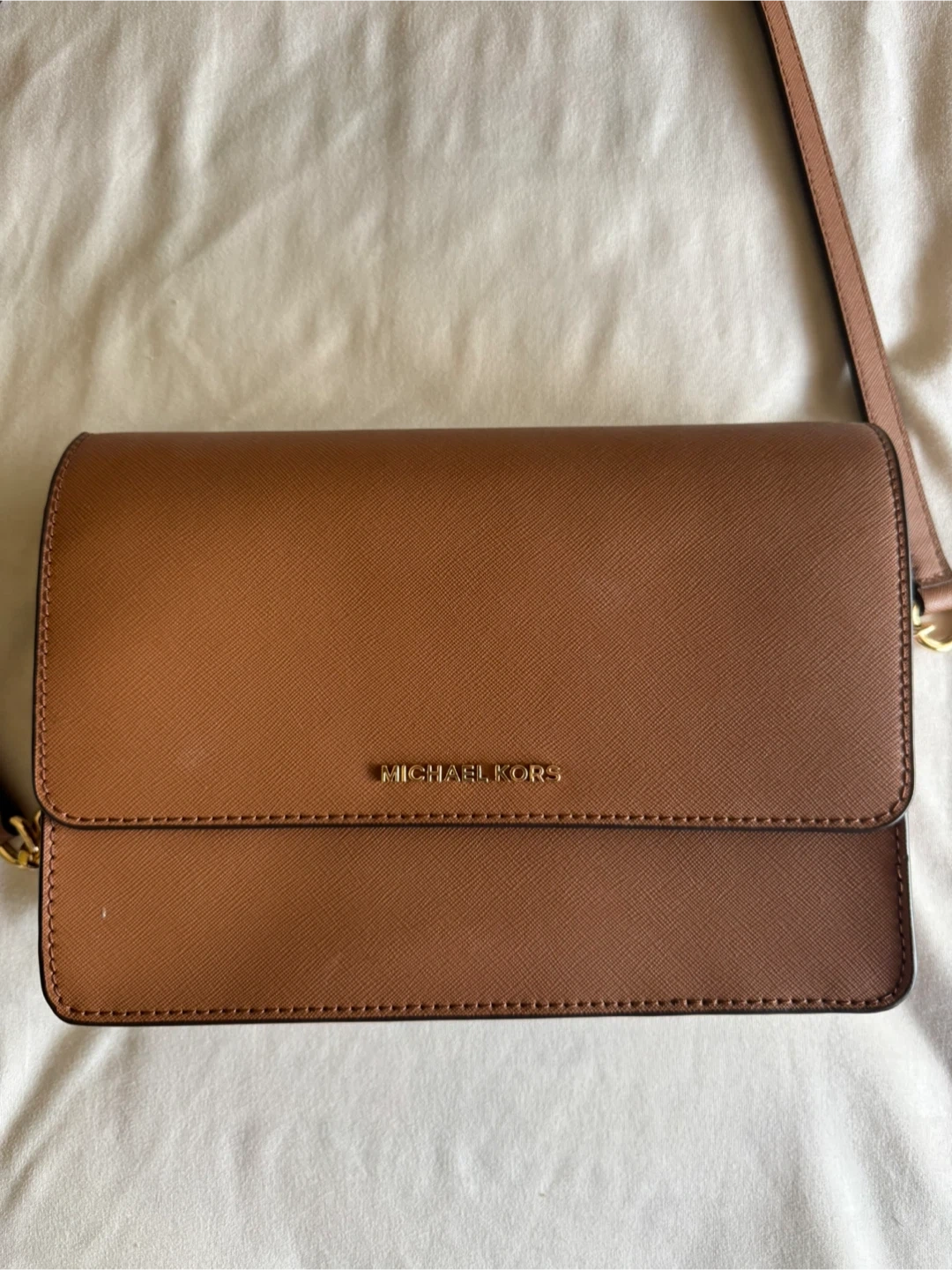This Michael Kors wallet crossbody is made from brown saffiano leather. It's a versatile accessory for carrying your essentials.