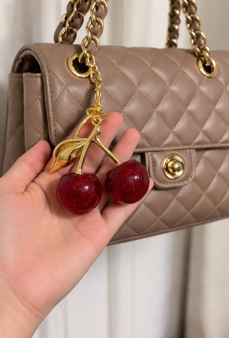 Sparkly cherry charm with a glossy red finish and gold-toned stem and leaf ๐โจ๏ธ