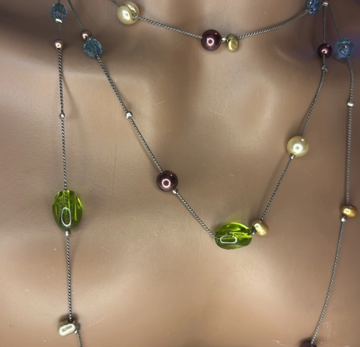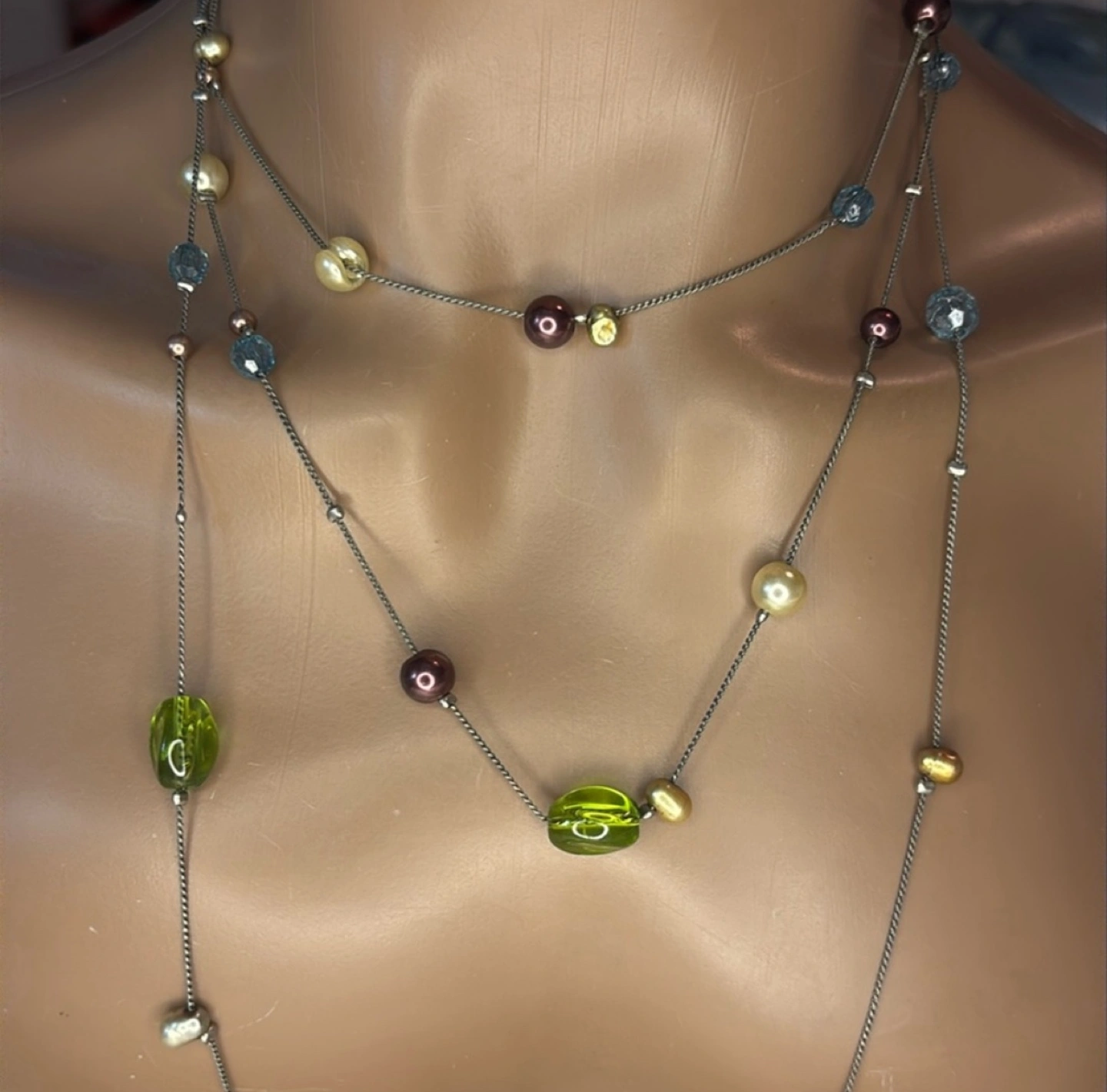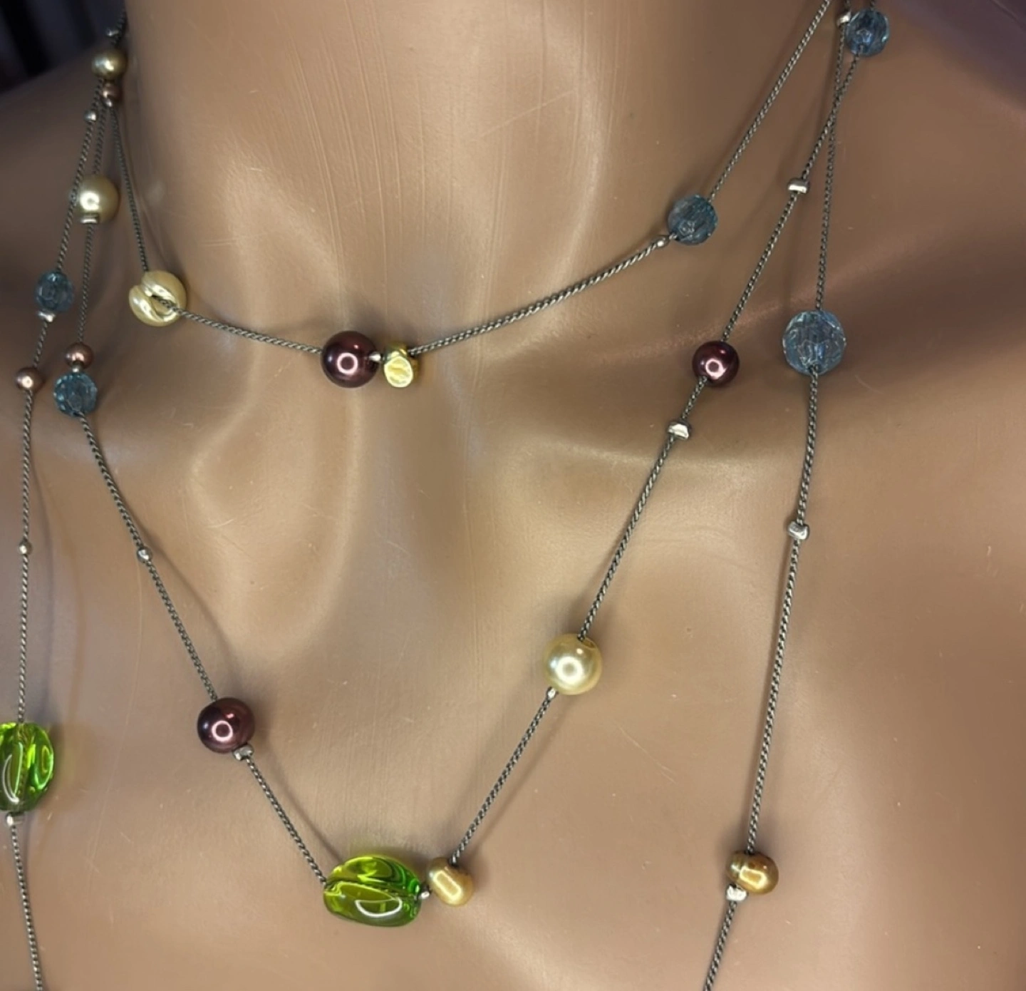 Long layered necklace. Features various beads: pearls, dark brown, light green, and blue. Metal chain. Excellent for layering or wearing alone.