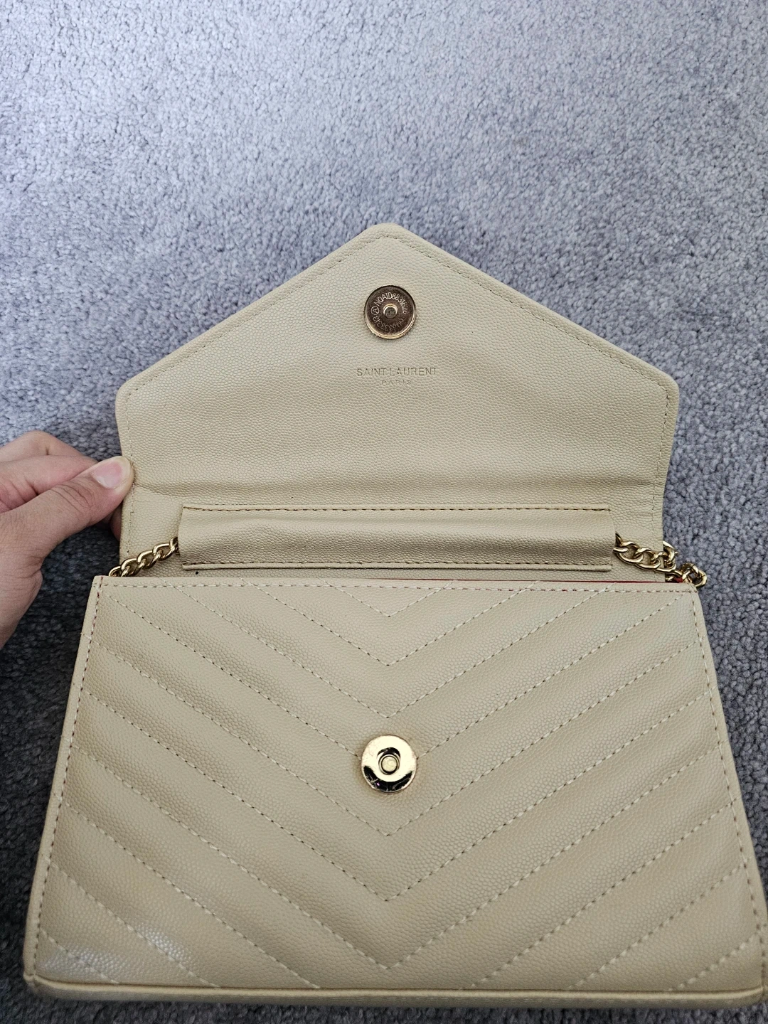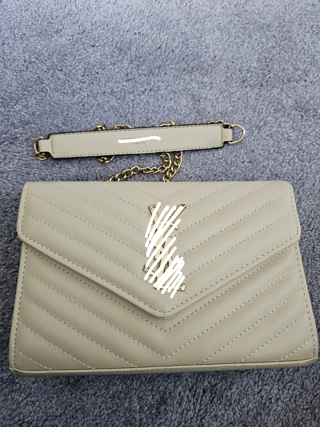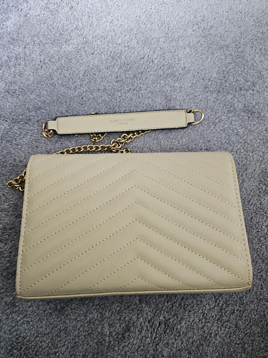 YSL-inspired wallet bag in beige chevron quilted leather. It has a snap closure and a gold chain strap.