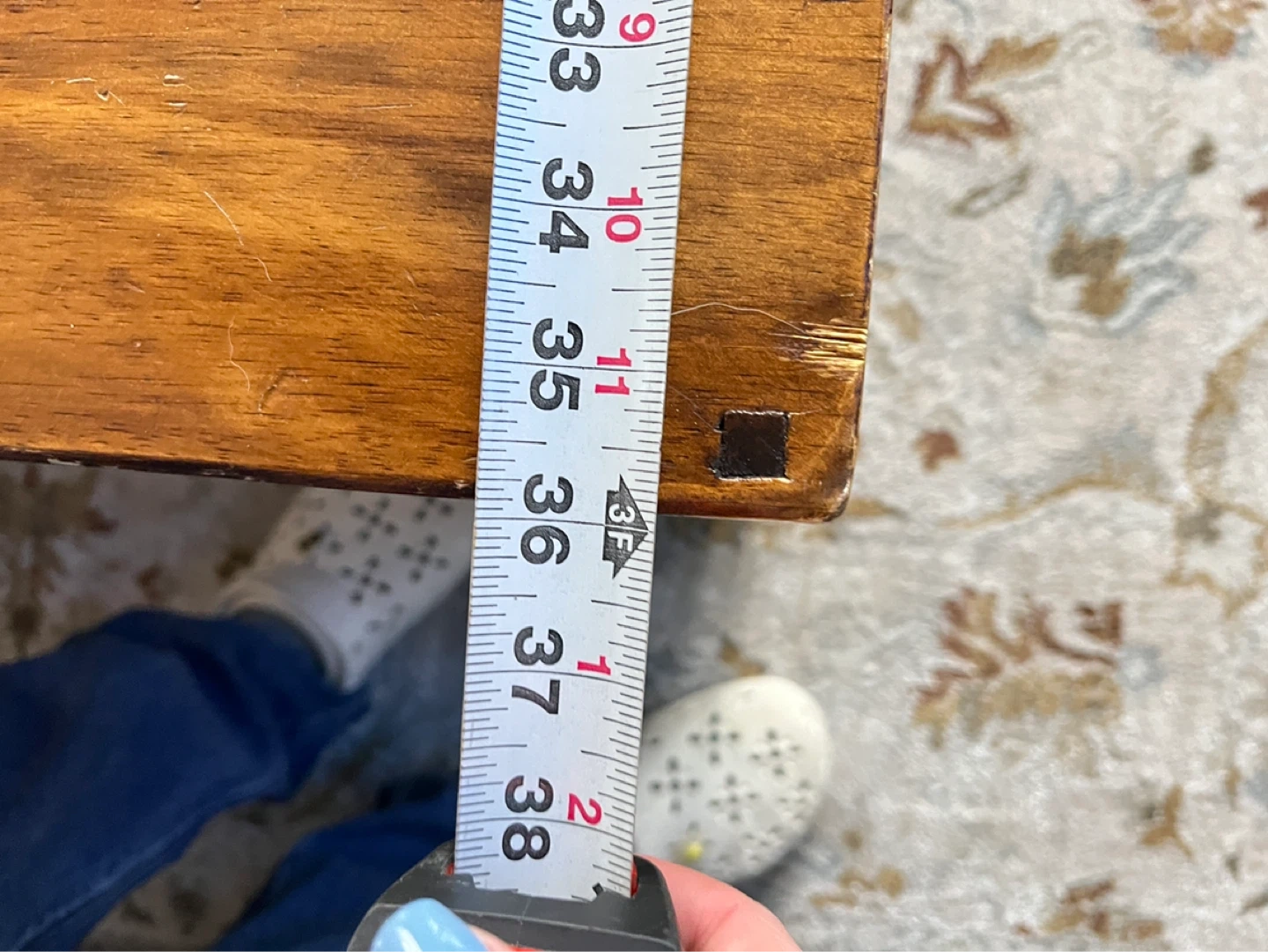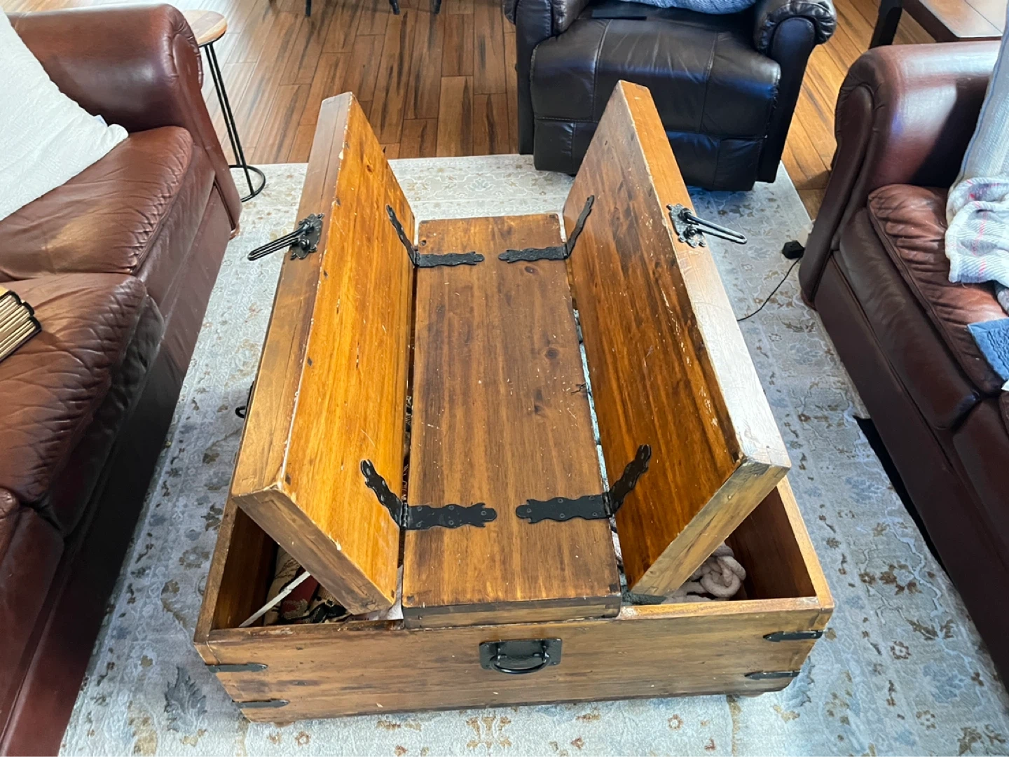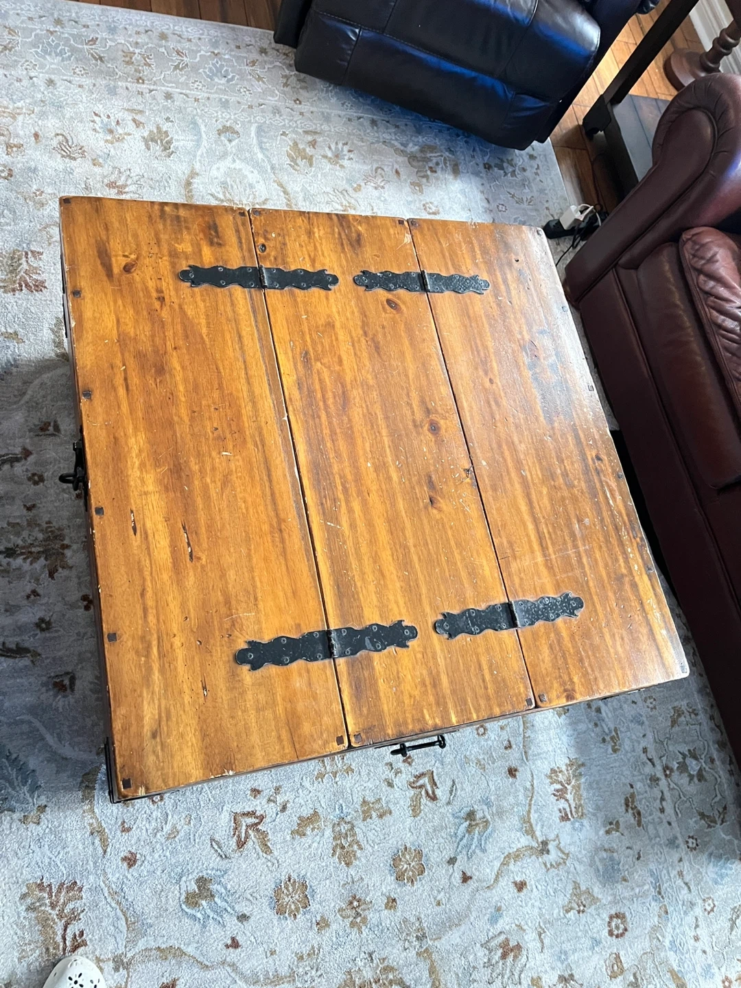 This wooden coffee table features a lift-top design, perfect for storing items. It's approximately 37 inches long and 20 inches high. The rustic wood finish adds character to any living space.