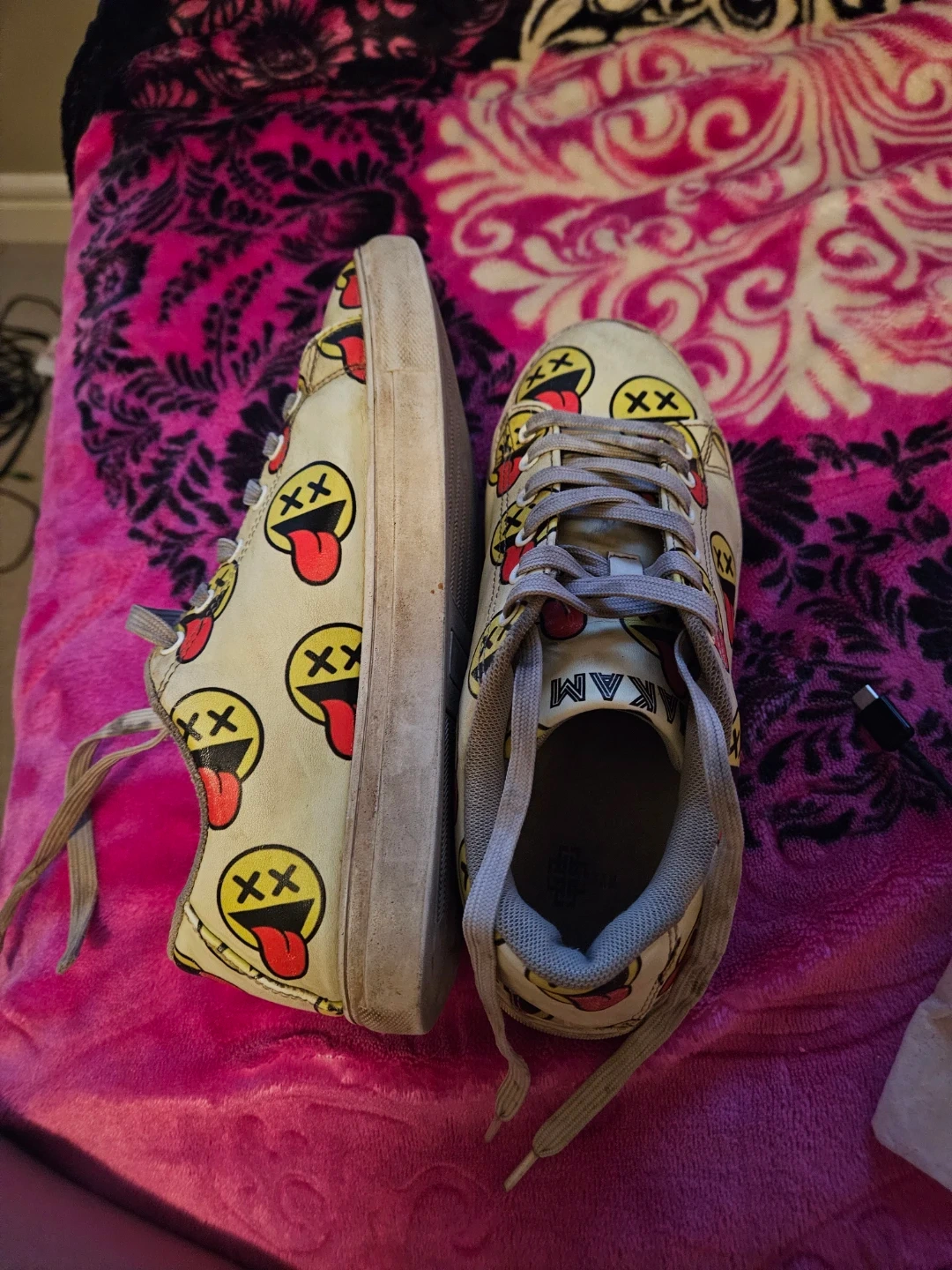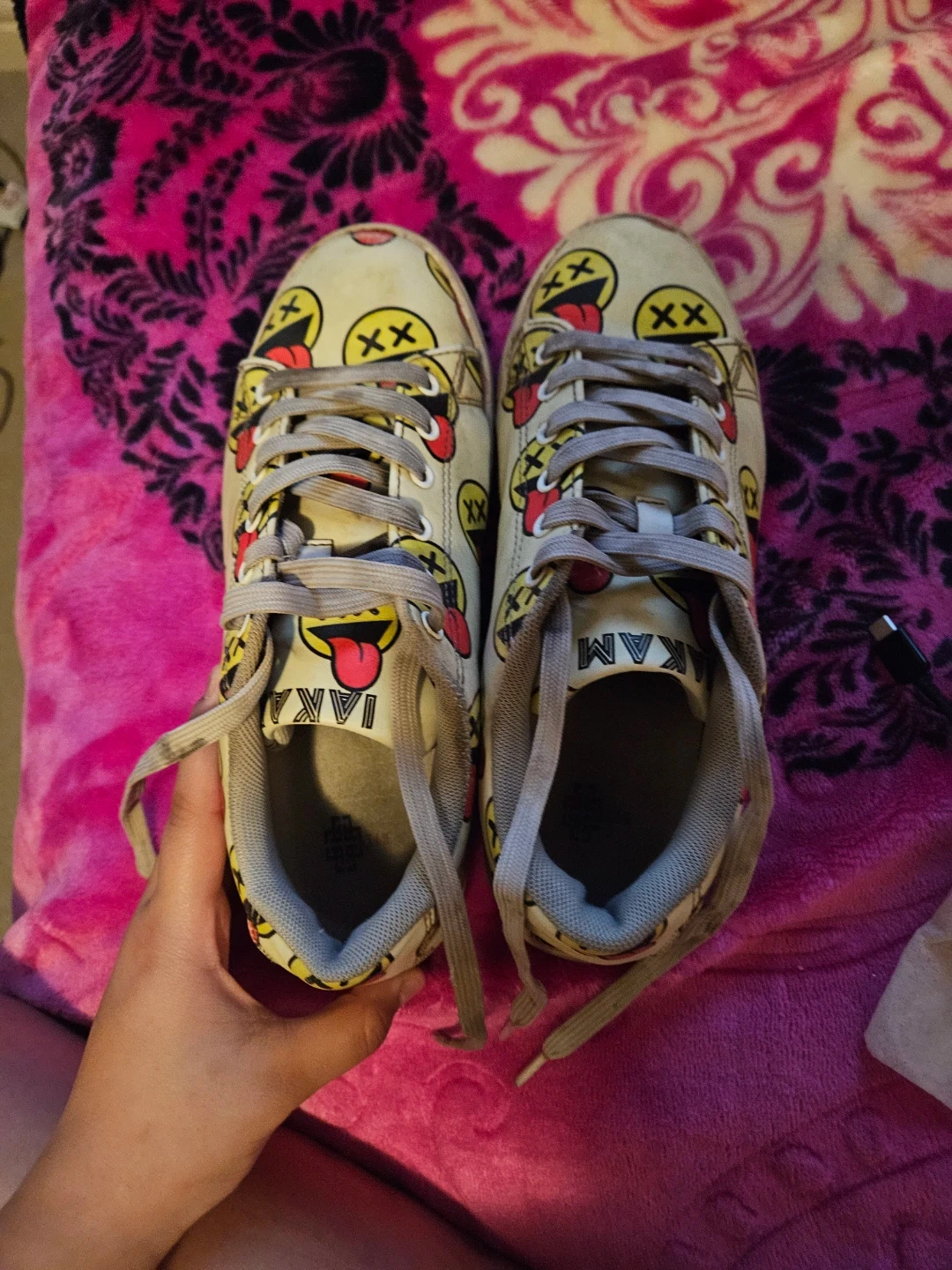 Iakam skate shoes with a fun emoji print all over. These low-top sneakers feature grey laces and a rubber sole. They're ready for some serious shredding!