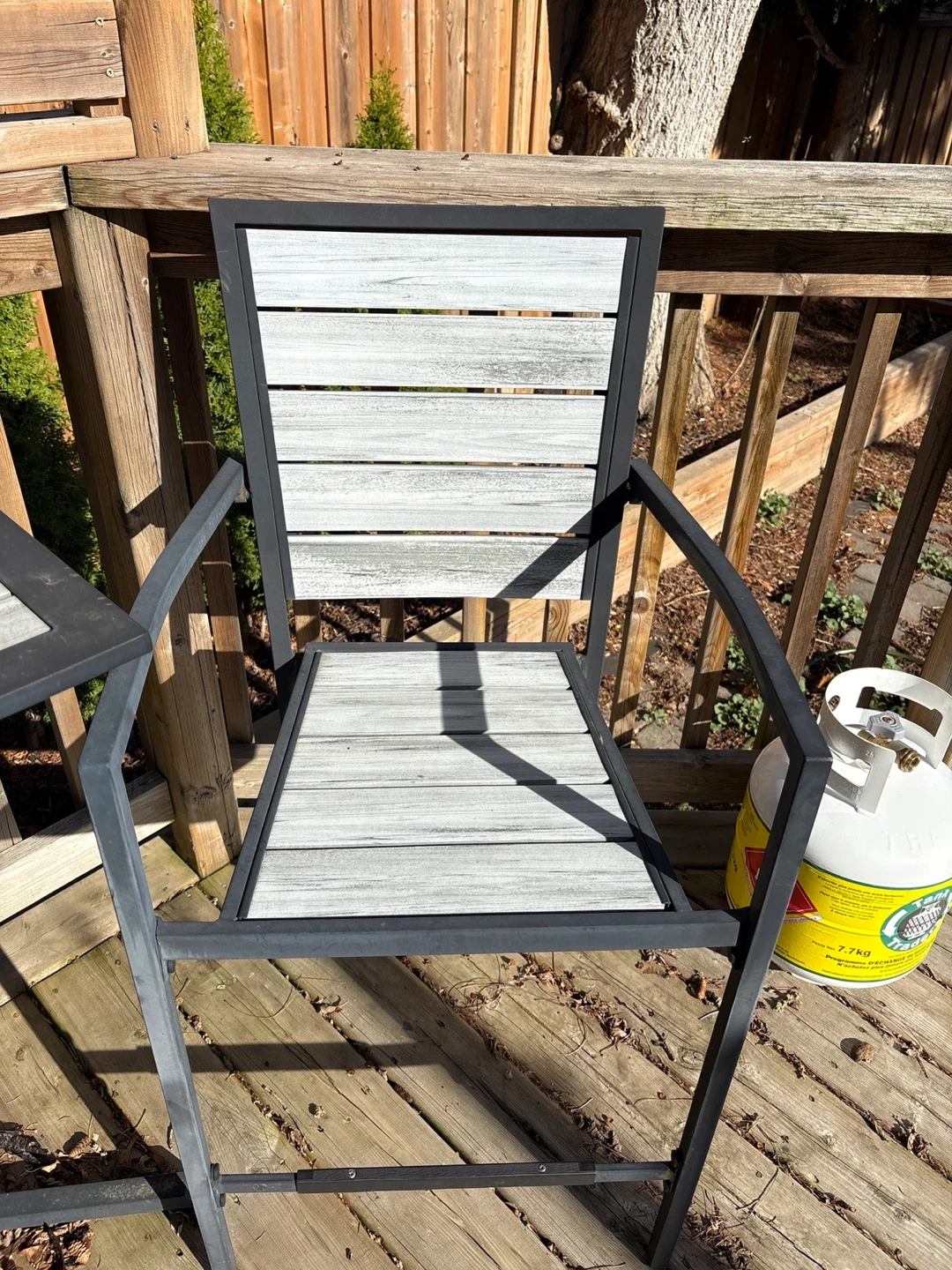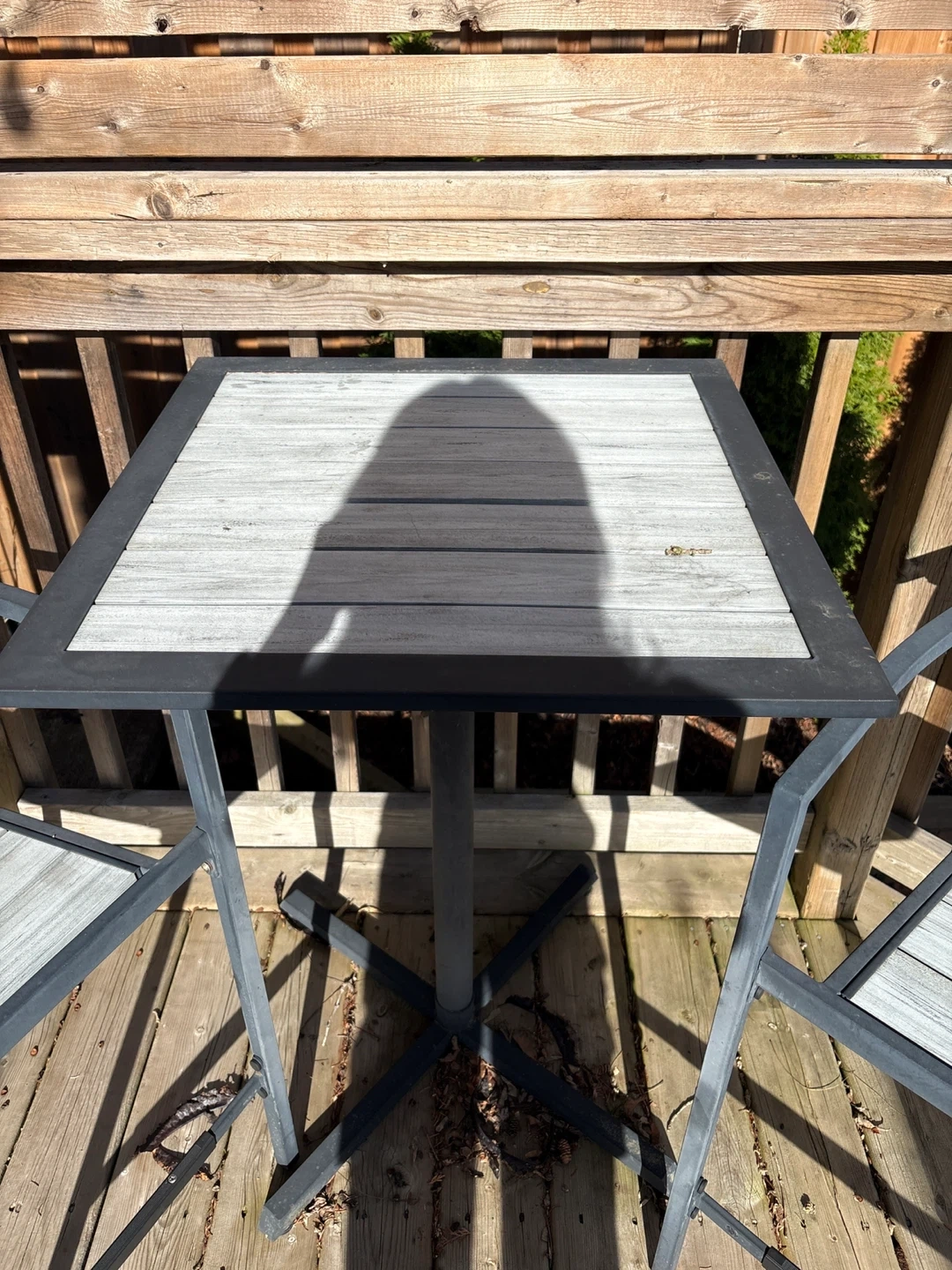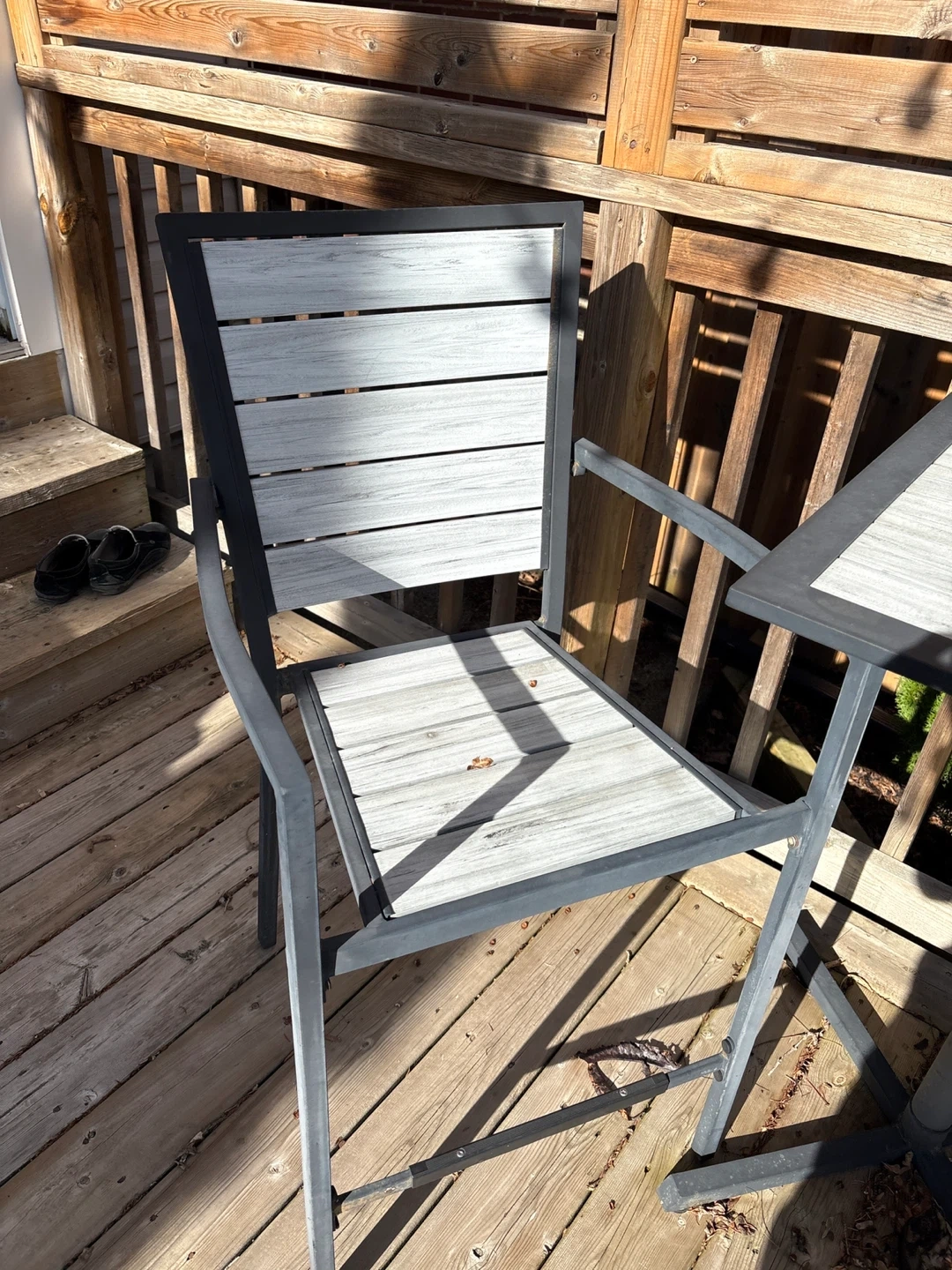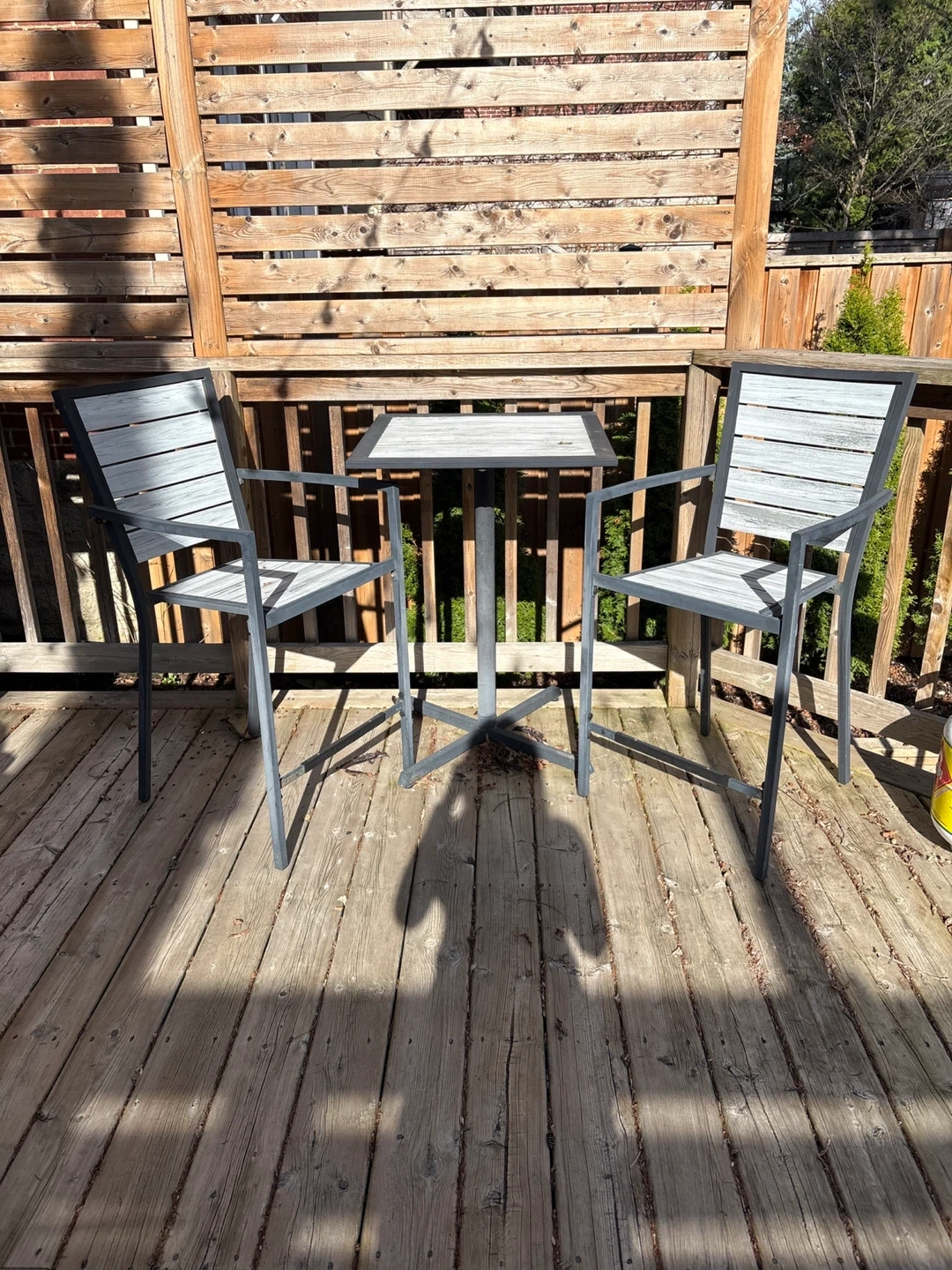 Grey and black metal patio bistro set. Includes one square table and two chairs. It's made with a durable metal frame and slatted composite wood seating. Perfect for small outdoor spaces!